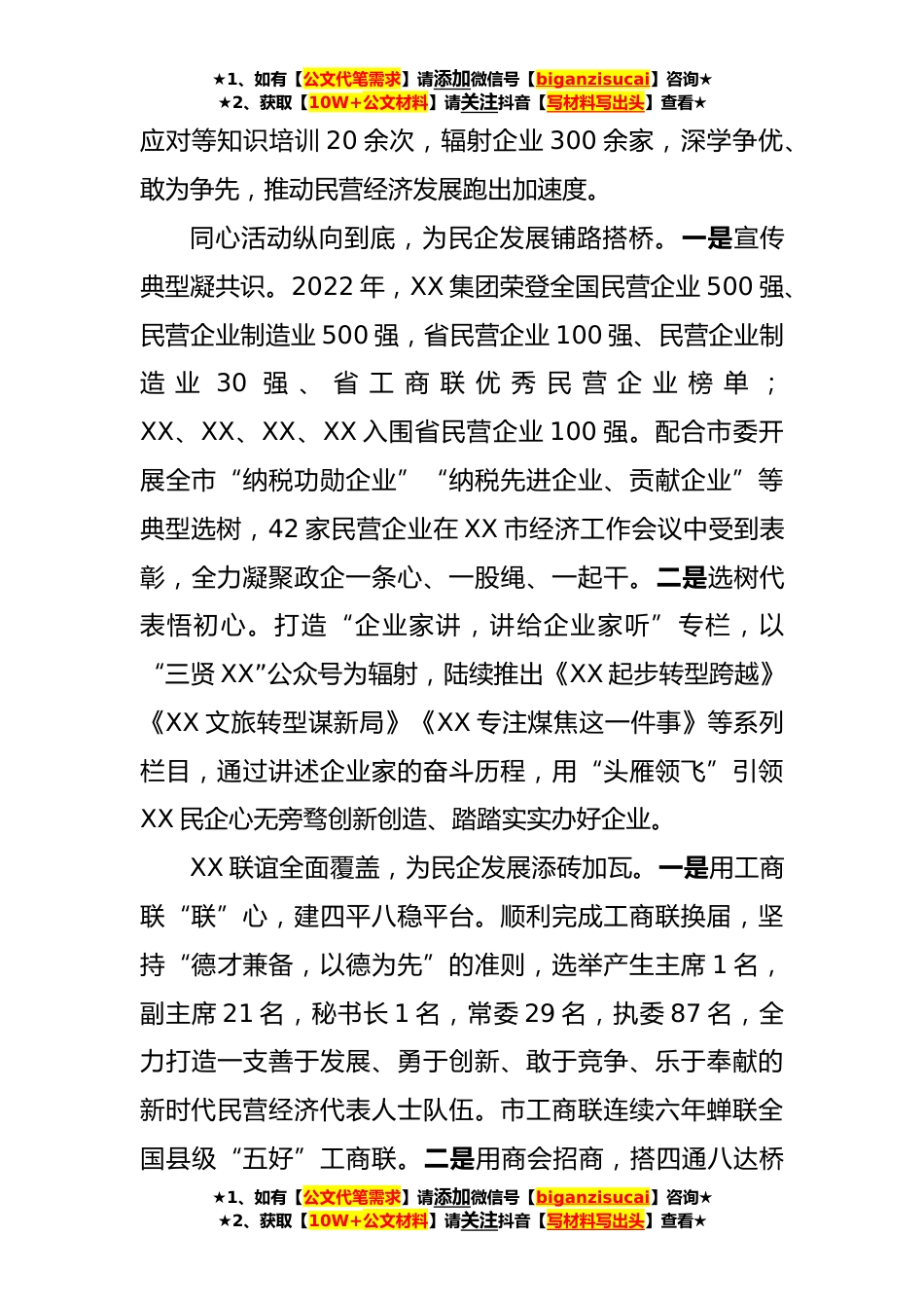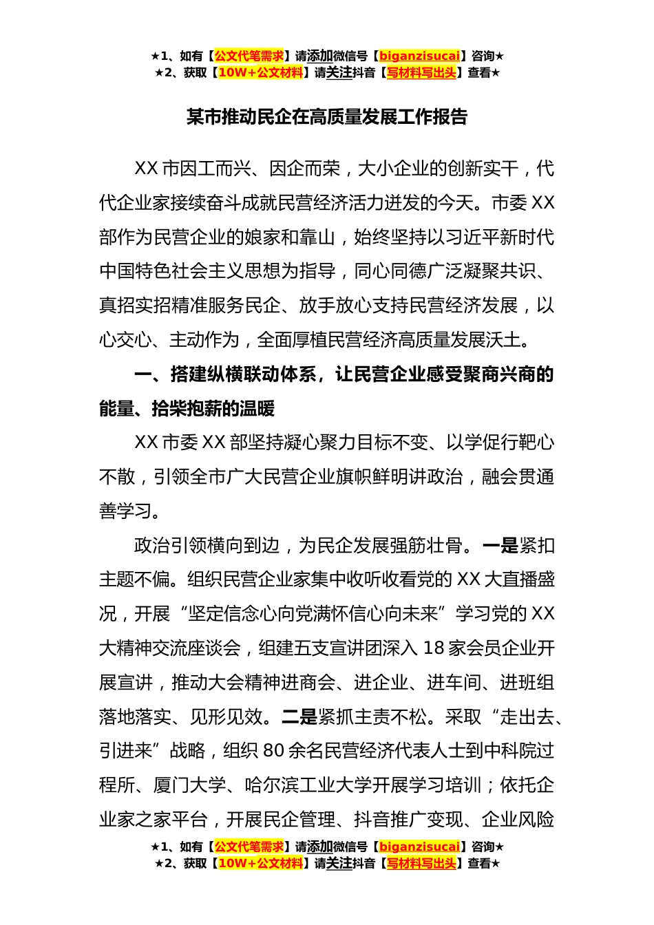★1、如有【公文代笔需求】请添加微信号【biganzisucai】咨询★★2、获取【10W+公文材料】请关注抖音【写材料写出头】查看★某市推动民企在高质量发展工作报告XX市因工而兴、因企而荣,大小企业的创新实干,代代企业家接续奋斗成就民营经济活力迸发的今天。市委XX部作为民营企业的娘家和靠山,始终坚持以习近平新时代中国特色社会主义思想为指导,同心同德广泛凝聚共识、真招实招精准服务民企、放手放心支持民营经济发展,以心交心、主动作为,全面厚植民营经济高质量发展沃土。一、搭建纵横联动体系,让民营企业感受聚商兴商的能量、拾柴抱薪的温暖XX市委XX部坚持凝心聚力目标不变、以学促行靶心不散,引领全市广大民营企业旗帜鲜明讲政治,融会贯通善学习。政治引领横向到边,为民企发展强筋壮骨。一是紧扣主题...