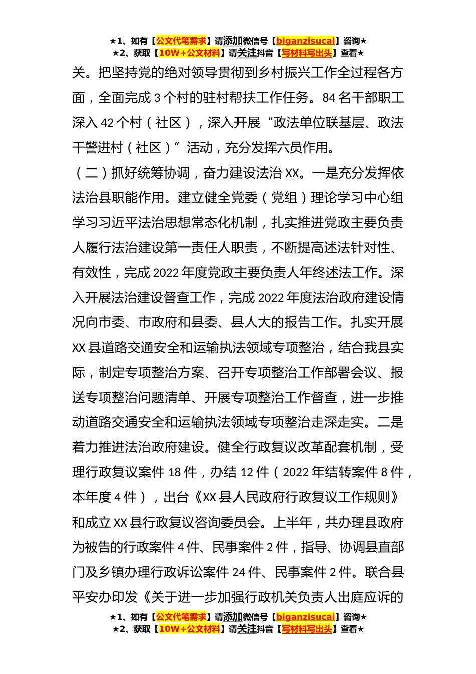 ★1、如有【公文代笔需求】请添加微信号【biganzisucai】咨询★★2、获取【10W+公文材料】请关注抖音【写材料写出头】查看★2023年上半年县司法局工作总结及下半年工作计划2023年上半年,我县司法行政工作坚持稳中求进总基调,在优化法治化营商环境、深化行政执法监督、强化法律服务、夯实基层基础等方面持续发力,奋力推进司法行政工作现代化,为加快建设现代化新XX提供了有力法治保障。一、2023年上半年工作开展情况(一)抓好党的建设,全面提振队伍形象。深入学习贯彻党的XX大精神,坚决落实习近平总书记重要指示批示精神,引导全体干部职工筑牢思想根基、锤炼政治品格,做到令行禁止,政令畅通。常态化开展党组“第一议题”学习,深入推进常态化“三整顿两提升”干部作风建设专项活动严格执行重大事项报告、...