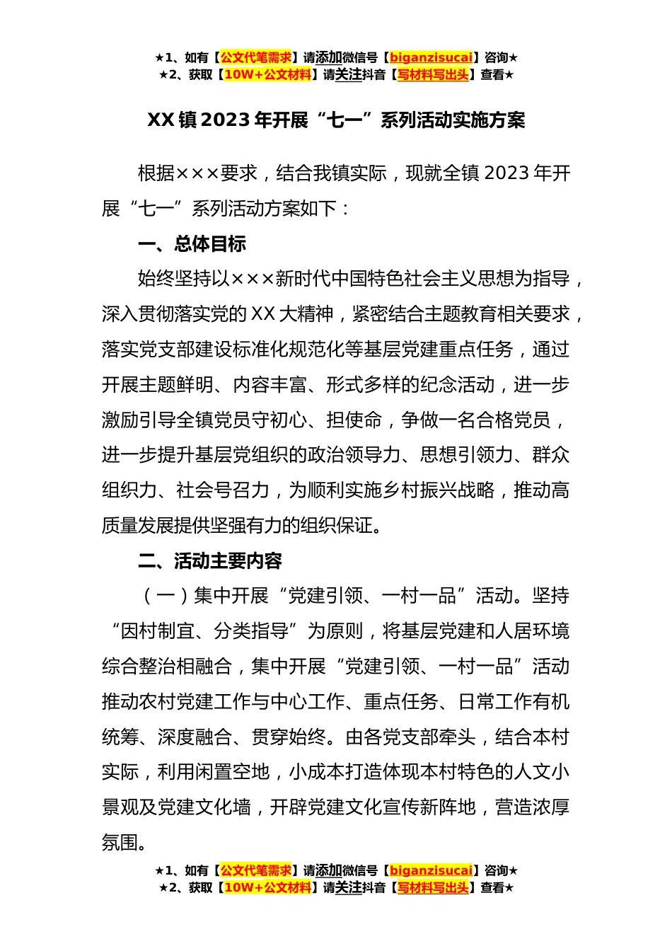 ★1、如有【公文代笔需求】请添加微信号【biganzisucai】咨询★★2、获取【10W+公文材料】请关注抖音【写材料写出头】查看★XX镇2023年开展“七一”系列活动实施方案根据×××要求,结合我镇实际,现就全镇2023年开展“七一”系列活动方案如下:一、总体目标始终坚持以×××新时代中国特色社会主义思想为指导,深入贯彻落实党的XX大精神,紧密结合主题教育相关要求,落实党支部建设标准化规范化等基层党建重点任务,通过开展主题鲜明、内容丰富、形式多样的纪念活动,进一步激励引导全镇党员守初心、担使命,争做一名合格党员,进一步提升基层党组织的政治领导力、思想引领力、群众组织力、社会号召力,为顺利实施乡村振兴战略,推动高质量发展提供坚强有力的组织保证。二、活动主要内容(一)集中开展“党建引...