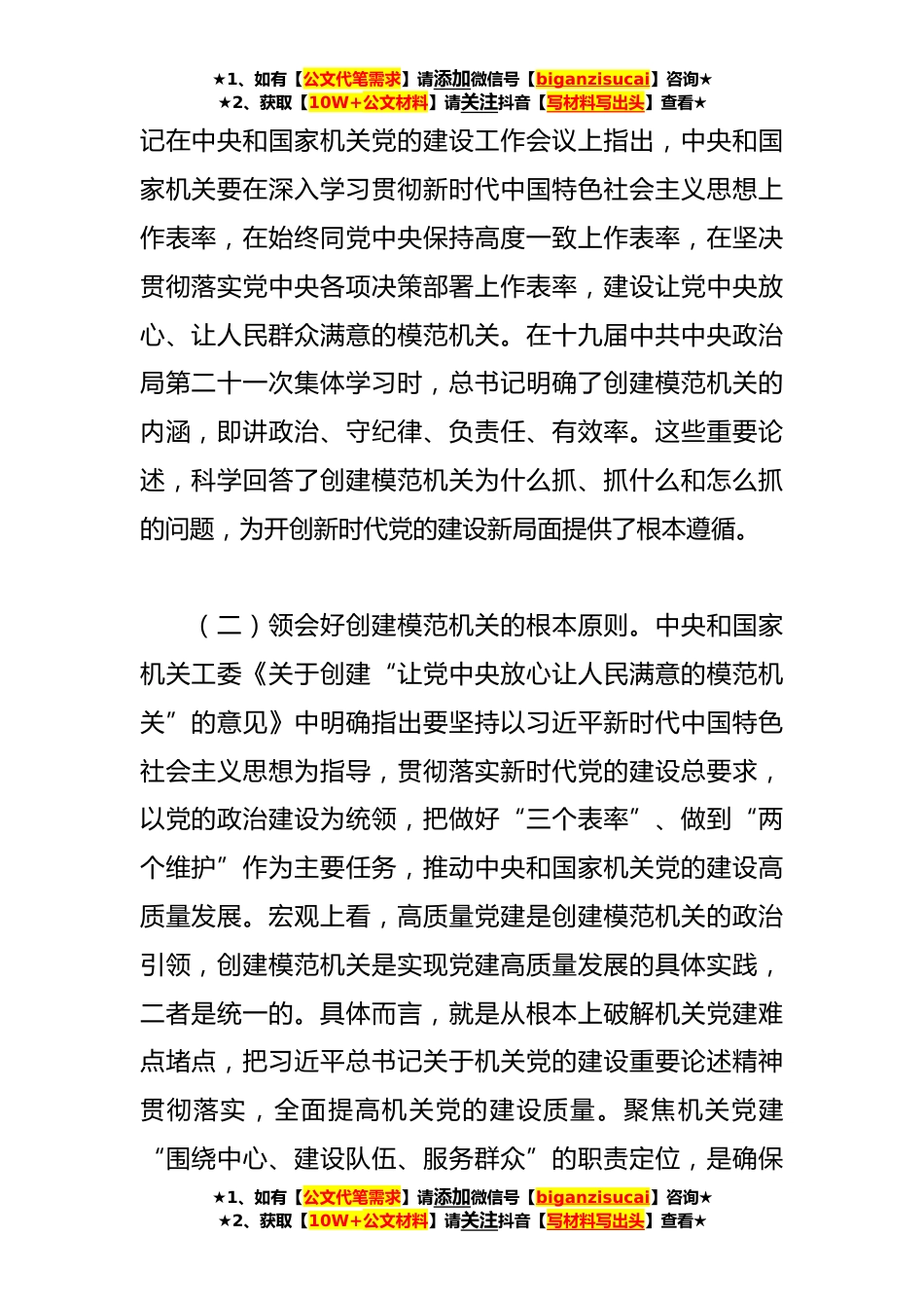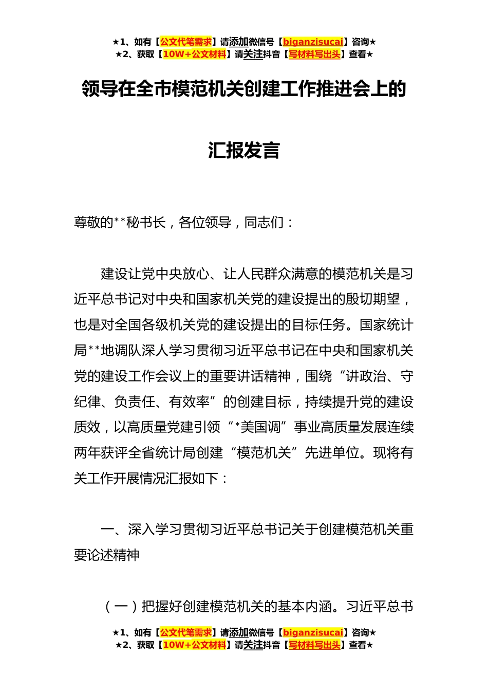 ★1、如有【公文代笔需求】请添加微信号【biganzisucai】咨询★★2、获取【10W+公文材料】请关注抖音【写材料写出头】查看★领导在全市模范机关创建工作推进会上的汇报发言尊敬的**秘书长,各位领导,同志们:建设让党中央放心、让人民群众满意的模范机关是习近平总书记对中央和国家机关党的建设提出的殷切期望,也是对全国各级机关党的建设提出的目标任务。国家统计局**地调队深人学习贯彻习近平总书记在中央和国家机关党的建设工作会议上的重要讲话精神,围绕“讲政治、守纪律、负责任、有效率”的创建目标,持续提升党的建设质效,以高质量党建引领“*美国调”事业高质量发展连续两年获评全省统计局创建“模范机关”先进单位。现将有关工作开展情况汇报如下:一、深入学习贯彻习近平总书记关于创建模范机关重要...