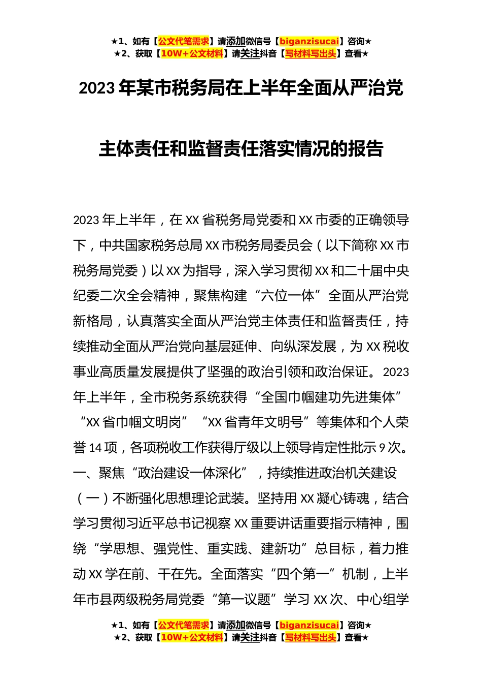 ★1、如有【公文代笔需求】请添加微信号【biganzisucai】咨询★★2、获取【10W+公文材料】请关注抖音【写材料写出头】查看★2023年某市税务局在上半年全面从严治党主体责任和监督责任落实情况的报告2023年上半年,在XX省税务局党委和XX市委的正确领导下,中共国家税务总局XX市税务局委员会(以下简称XX市税务局党委)以XX为指导,深入学习贯彻XX和二十届中央纪委二次全会精神,聚焦构建“六位一体”全面从严治党新格局,认真落实全面从严治党主体责任和监督责任,持续推动全面从严治党向基层延伸、向纵深发展,为XX税收事业高质量发展提供了坚强的政治引领和政治保证。2023年上半年,全市税务系统获得“全国巾帼建功先进集体”“XX省巾帼文明岗”“XX省青年文明号”等集体和个人荣誉14项,各项税收工作获得厅级以...