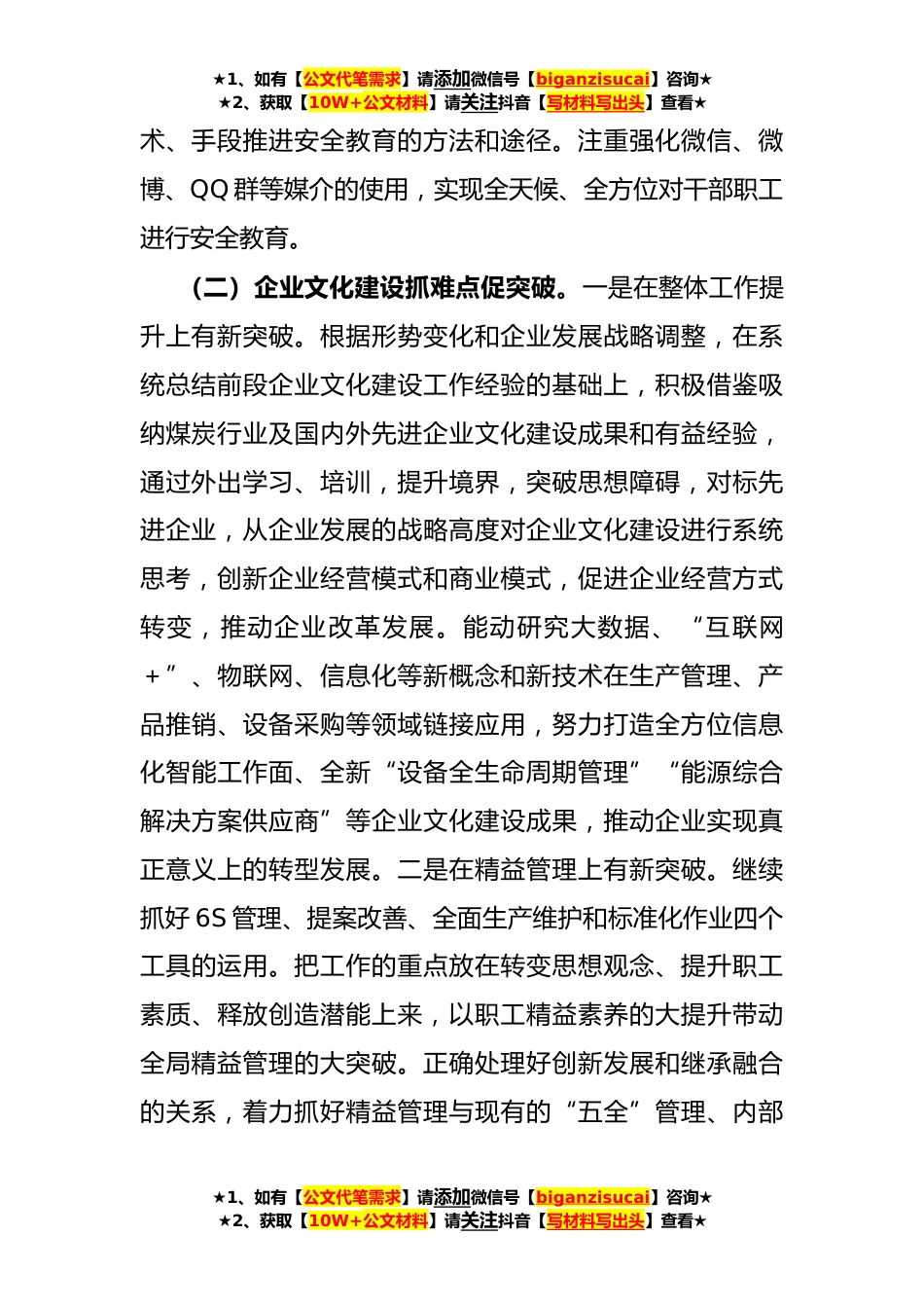 ★1、如有【公文代笔需求】请添加微信号【biganzisucai】咨询★★2、获取【10W+公文材料】请关注抖音【写材料写出头】查看★国有企业宣传思想文化工作2023年下半年打算针对2023年上半年存在的问题不足,2023年下半年,公司将重点落实好“五抓五促”:(一)日常教育抓重点促实效。一是重点抓好党的二十大精神的学习宣传贯彻和主题教育组织开展。组织广大党员深入学习贯彻好党的二十大精神和习近平总书记系列重要讲话精神,严格执行好《党委理论中心组学习制度》,制定下发两级党委中心组学习安排意见。围绕提高学习质量,积极探索创新学习形式,常态化办好过硬党支部论坛和合格党员讲坛,同时至少组织一次专家报告会、一次集中学习会。加强理论宣教基地建设,充分发挥理论骨干作用,广泛开展理论宣讲活动,抓好面...