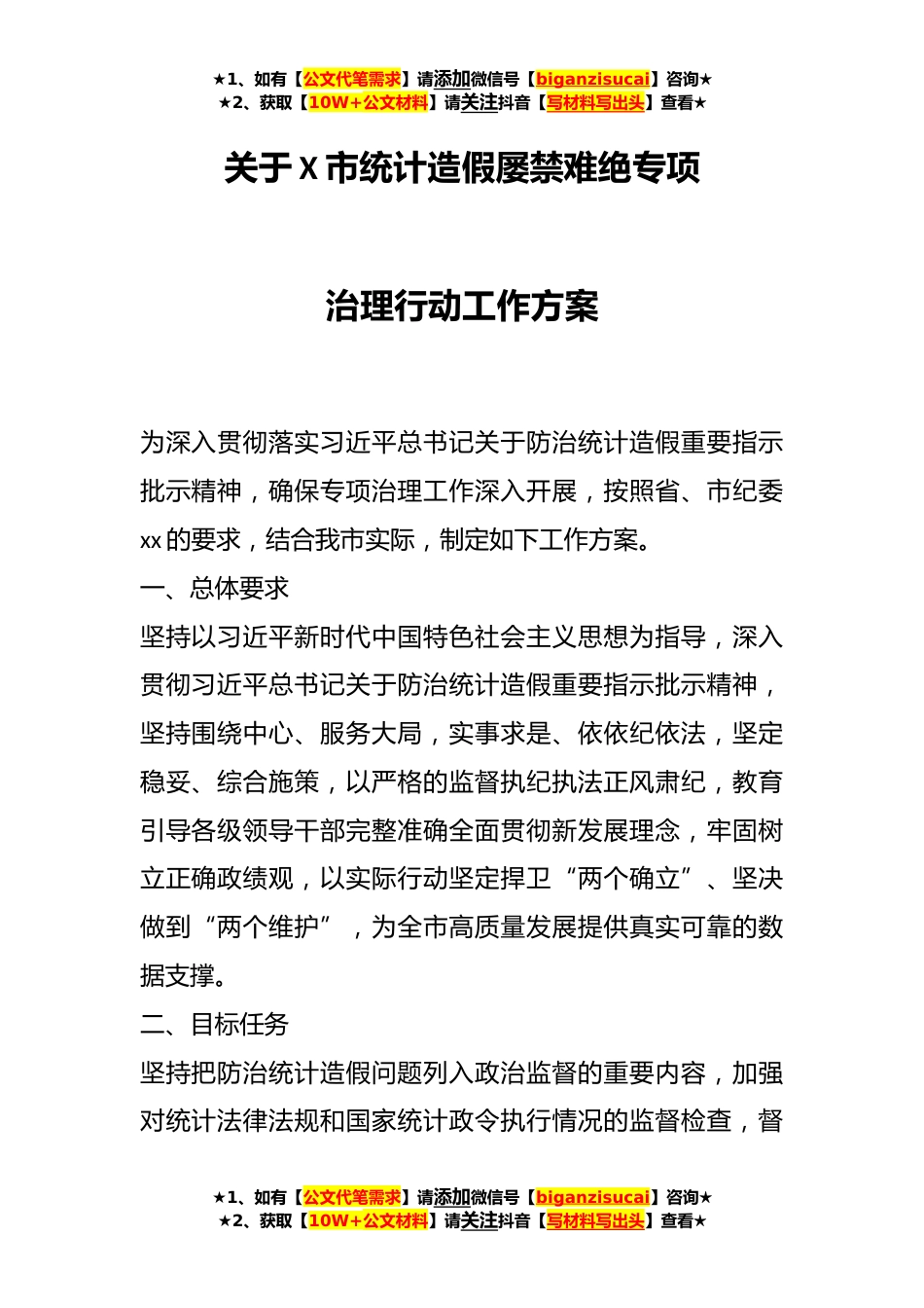 ★1、如有【公文代笔需求】请添加微信号【biganzisucai】咨询★★2、获取【10W+公文材料】请关注抖音【写材料写出头】查看★关于X市统计造假屡禁难绝专项治理行动工作方案为深入贯彻落实习近平总书记关于防治统计造假重要指示批示精神,确保专项治理工作深入开展,按照省、市纪委xx的要求,结合我市实际,制定如下工作方案。一、总体要求坚持以习近平新时代中国特色社会主义思想为指导,深入贯彻习近平总书记关于防治统计造假重要指示批示精神,坚持围绕中心、服务大局,实事求是、依依纪依法,坚定稳妥、综合施策,以严格的监督执纪执法正风肃纪,教育引导各级领导干部完整准确全面贯彻新发展理念,牢固树立正确政绩观,以实际行动坚定捍卫“两个确立”、坚决做到“两个维护”,为全市高质量发展提供真实可靠的数...
