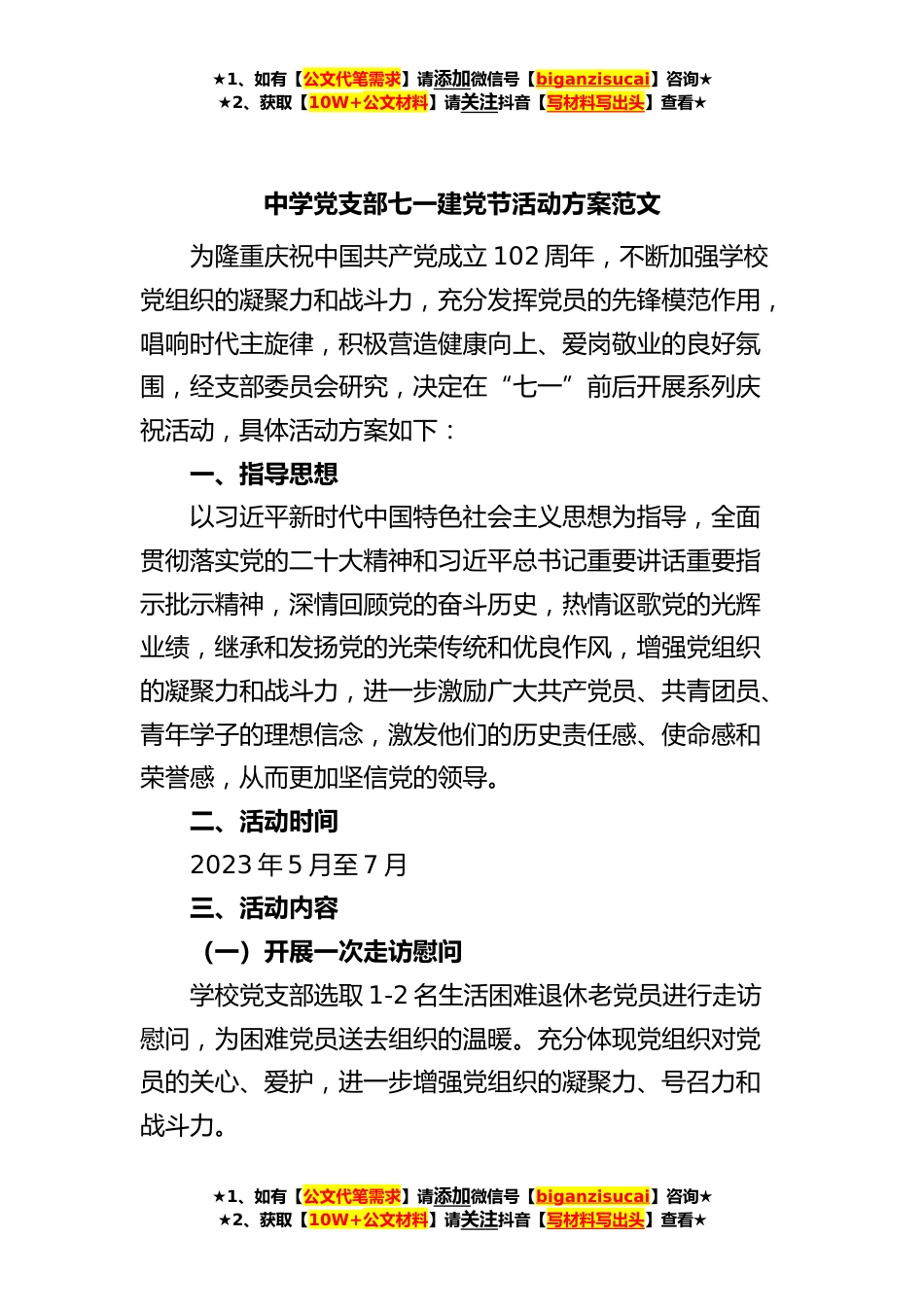 ★1、如有【公文代笔需求】请添加微信号【biganzisucai】咨询★★2、获取【10W+公文材料】请关注抖音【写材料写出头】查看★中学党支部七一建党节活动方案范文为隆重庆祝中国共产党成立102周年,不断加强学校党组织的凝聚力和战斗力,充分发挥党员的先锋模范作用,唱响时代主旋律,积极营造健康向上、爱岗敬业的良好氛围,经支部委员会研究,决定在“七一”前后开展系列庆祝活动,具体活动方案如下:一、指导思想以习近平新时代中国特色社会主义思想为指导,全面贯彻落实党的二十大精神和习近平总书记重要讲话重要指示批示精神,深情回顾党的奋斗历史,热情讴歌党的光辉业绩,继承和发扬党的光荣传统和优良作风,增强党组织的凝聚力和战斗力,进一步激励广大共产党员、共青团员、青年学子的理想信念,激发他们的历...