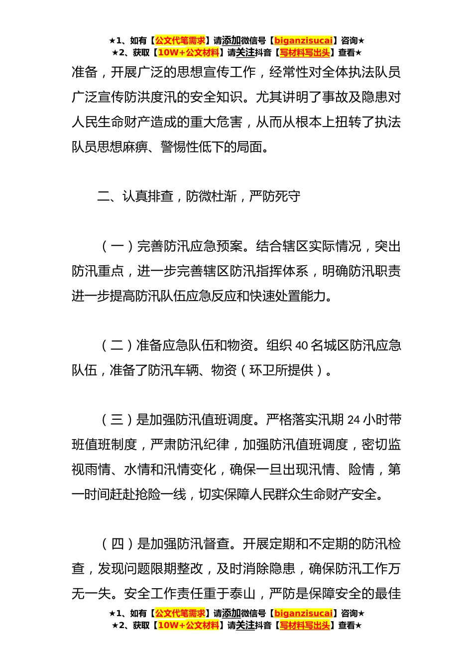 ★1、如有【公文代笔需求】请添加微信号【biganzisucai】咨询★★2、获取【10W+公文材料】请关注抖音【写材料写出头】查看★2023年XX区城管局上半年防汛应急工作总结及下一步工作打算按照区委区政府及区防汛抗旱指挥部减灾工作要求,区城管局树立“安全第一、常备不懈、以防为主、防重于抢”工作方针,成立以局党委书记、局长为组长,分管副大队长为副组长,各中队和机关各科室负责人为成员的防汛应急领导小组,修订和完善了《XX区城管局防汛应急预案》,建立健全岗位工作责任制、值班制度、汛情报告制度等一系列防汛工作制度。组织40名城区防汛应急队伍,在城区各重点地段路段进行巡查、紧急排水和交通疏导,开展2次防汛演练活动,顺利完成本年度防汛应急工作,现就我局2023年防汛应急工作总结如下:一、领导重视...