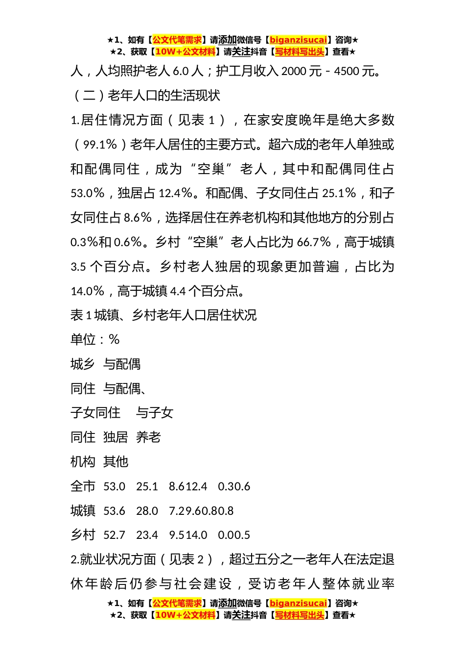 ★1、如有【公文代笔需求】请添加微信号【biganzisucai】咨询★★2、获取【10W+公文材料】请关注抖音【写材料写出头】查看★关于老龄人口养老和健康情况专项调研报告近期市统计局在全市范围内开展老龄人口养老和健康情况专项调研,现将调研结果报告如下:一、调研基本情况本次专项调研,通过座谈、问卷访问等方式,了解60岁及以上居民的婚姻状况、居住情况、健康状况和养老意愿等情况;了解养老机构的基本情况、运营状况和困难建议等共收集居民有效问卷347份,养老机构有效问卷15份。(一)问卷概况1.老年人口:从调研对象的居住地看,居住在城镇的占36.0%,居住在乡村的占64.0%。从性别结构看,男性占53.9%,女性占46.1%;从婚姻状况看,已婚占82.1%,未婚占2.0%,离异占0.3%,丧偶占15.6%。2.养老机构:...