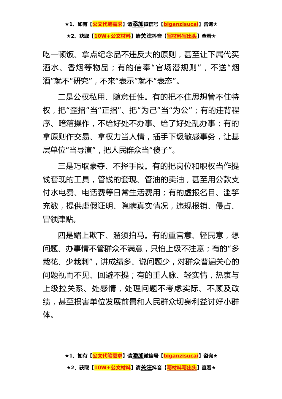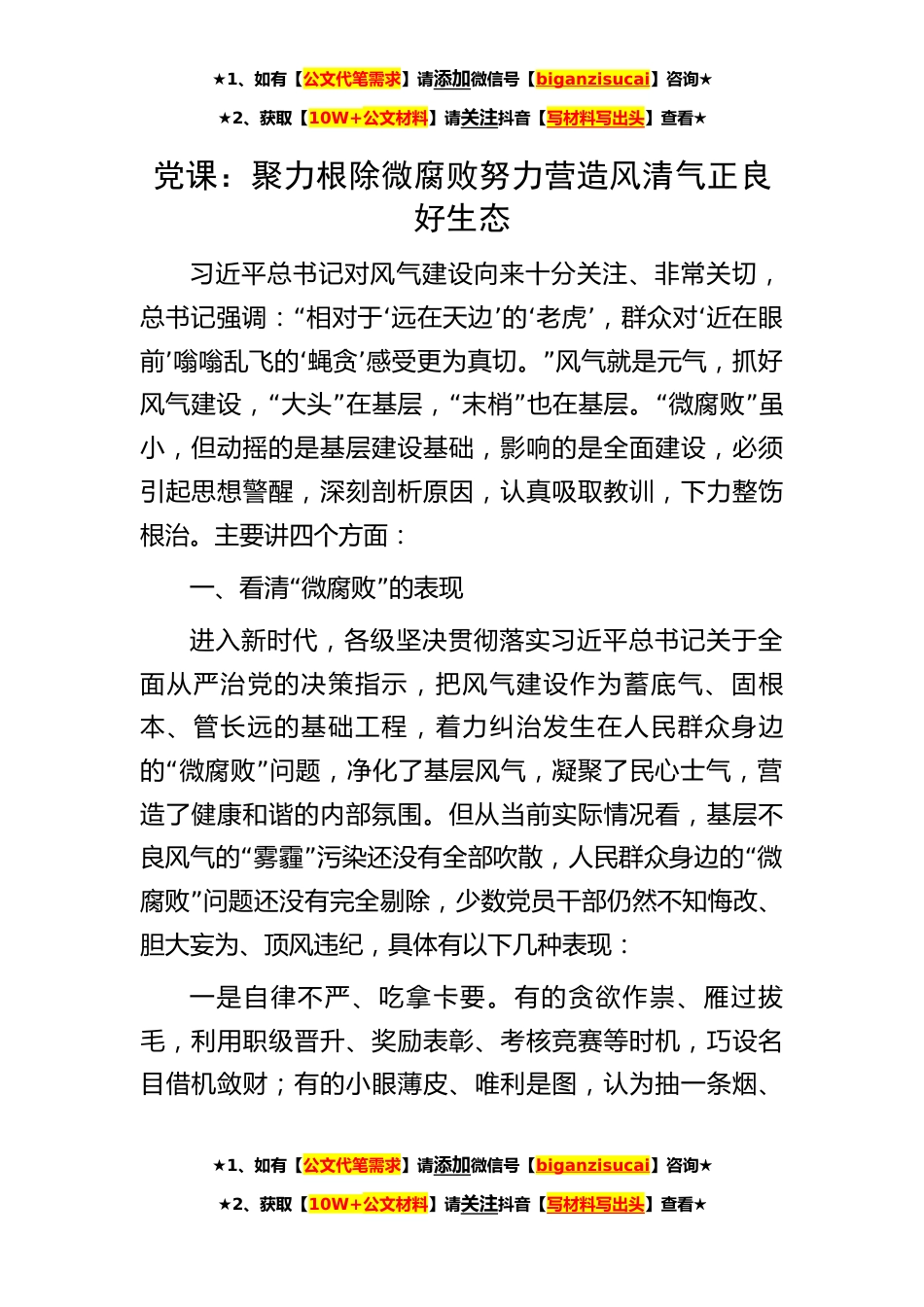 ★1、如有【公文代笔需求】请添加微信号【biganzisucai】咨询★★2、获取【10W+公文材料】请关注抖音【写材料写出头】查看★党课:聚力根除微腐败努力营造风清气正良好生态习近平总书记对风气建设向来十分关注、非常关切,“‘’‘’‘总书记强调:相对于远在天边的老虎,群众对近在眼’‘’”前嗡嗡乱飞的蝇贪感受更为真切。风气就是元气,抓好“”“”“”风气建设,大头在基层,末梢也在基层。微腐败虽小,但动摇的是基层建设基础,影响的是全面建设,必须引起思想警醒,深刻剖析原因,认真吸取教训,下力整饬根治。主要讲四个方面:“”一、看清微腐败的表现进入新时代,各级坚决贯彻落实习近平总书记关于全面从严治党的决策指示,把风气建设作为蓄底气、固根本、管长远的基础工程,着力纠治发生在人民群众身...