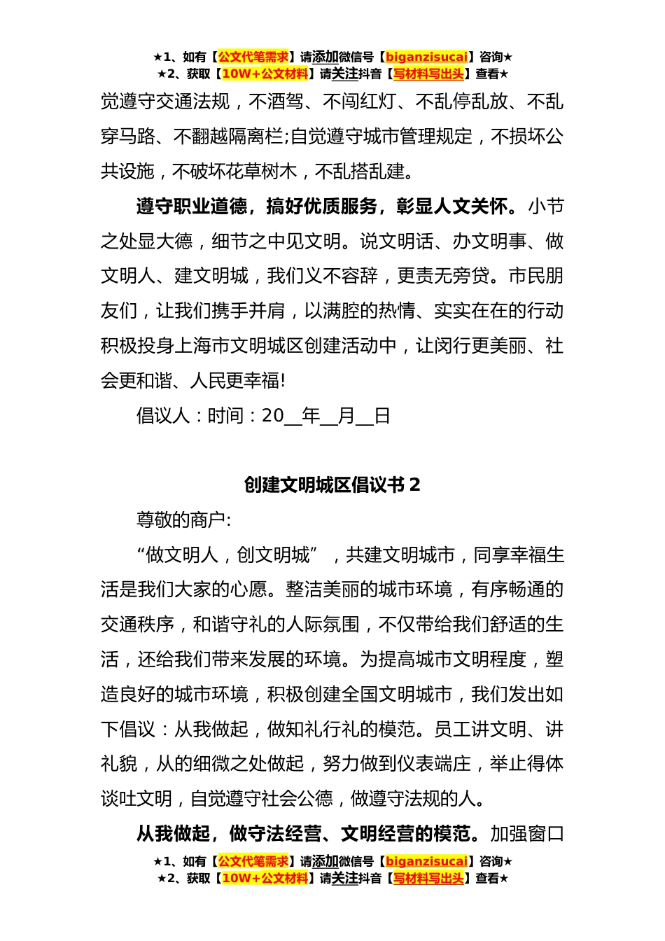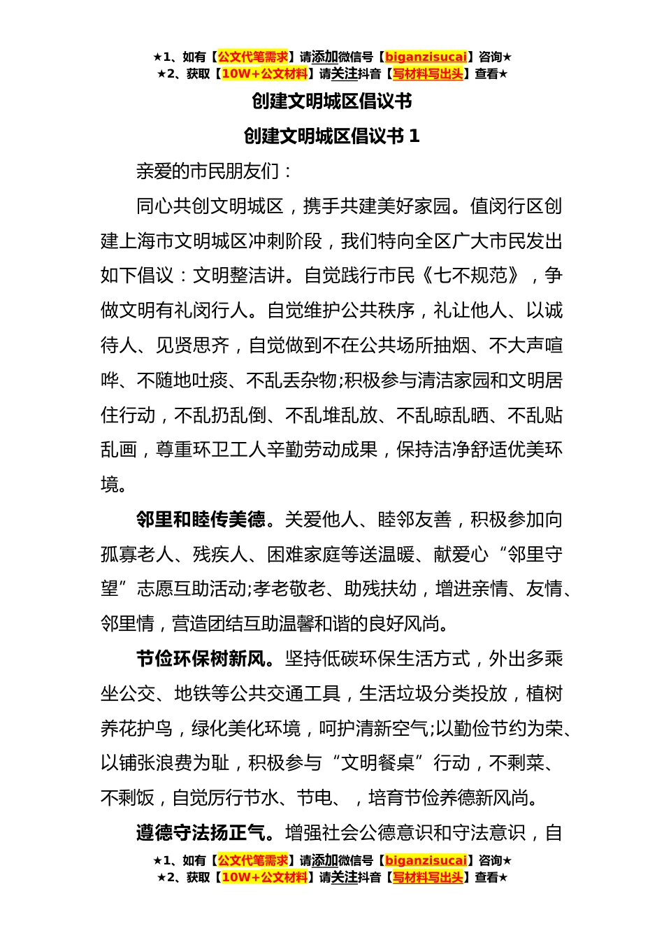 ★1、如有【公文代笔需求】请添加微信号【biganzisucai】咨询★★2、获取【10W+公文材料】请关注抖音【写材料写出头】查看★创建文明城区倡议书创建文明城区倡议书1亲爱的市民朋友们:同心共创文明城区,携手共建美好家园。值闵行区创建上海市文明城区冲刺阶段,我们特向全区广大市民发出如下倡议:文明整洁讲。自觉践行市民《七不规范》,争做文明有礼闵行人。自觉维护公共秩序,礼让他人、以诚待人、见贤思齐,自觉做到不在公共场所抽烟、不大声喧哗、不随地吐痰、不乱丢杂物;积极参与清洁家园和文明居住行动,不乱扔乱倒、不乱堆乱放、不乱晾乱晒、不乱贴乱画,尊重环卫工人辛勤劳动成果,保持洁净舒适优美环境。邻里和睦传美德。关爱他人、睦邻友善,积极参加向孤寡老人、残疾人、困难家庭等送温暖、献爱心“...