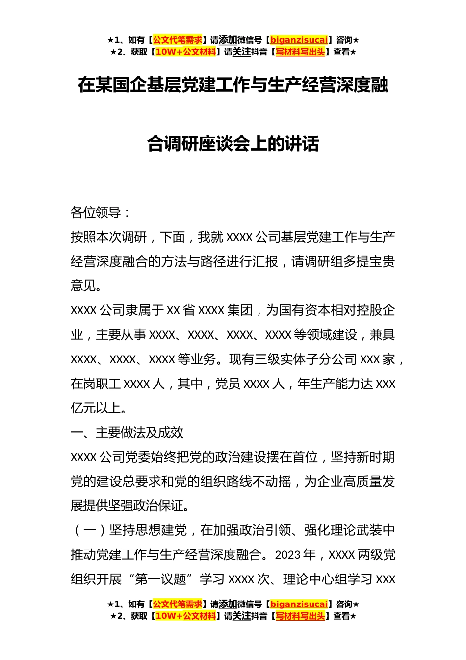 ★1、如有【公文代笔需求】请添加微信号【biganzisucai】咨询★★2、获取【10W+公文材料】请关注抖音【写材料写出头】查看★在某国企基层党建工作与生产经营深度融合调研座谈会上的讲话各位领导:按照本次调研,下面,我就XXXX公司基层党建工作与生产经营深度融合的方法与路径进行汇报,请调研组多提宝贵意见。XXXX公司隶属于XX省XXXX集团,为国有资本相对控股企业,主要从事XXXX、XXXX、XXXX、XXXX等领域建设,兼具XXXX、XXXX、XXXX等业务。现有三级实体子分公司XXX家,在岗职工XXXX人,其中,党员XXXX人,年生产能力达XXX亿元以上。一、主要做法及成效XXXX公司党委始终把党的政治建设摆在首位,坚持新时期党的建设总要求和党的组织路线不动摇,为企业高质量发展提供坚强政治保证。(一)坚持思想建党,在加强政...