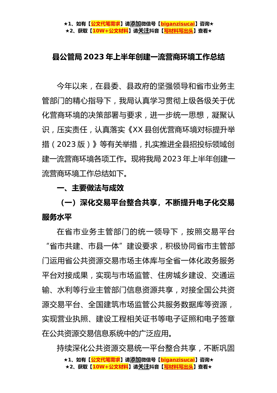 ★1、如有【公文代笔需求】请添加微信号【biganzisucai】咨询★★2、获取【10W+公文材料】请关注抖音【写材料写出头】查看★县公管局2023年上半年创建一流营商环境工作总结今年以来,在县委、县政府的坚强领导和省市业务主管部门的精心指导下,我局认真学习贯彻上级各级关于优化营商环境的决策部署与要求,进一步统一思想,凝聚认识,压实责任,认真落实《XX县创优营商环境对标提升举措(2023版)》等有关举措,扎实推进全县招投标领域创建一流营商环境各项工作。现将我局2023年上半年创建一流营商环境工作总结如下。一、主要做法与成效(一)深化交易平台整合共享,不断提升电子化交易服务水平在省市业务主管部门的统一领导下,按照交易平台“省市共建、市县一体”建设要求,积极协同省市主管部门运用省公共资源...
