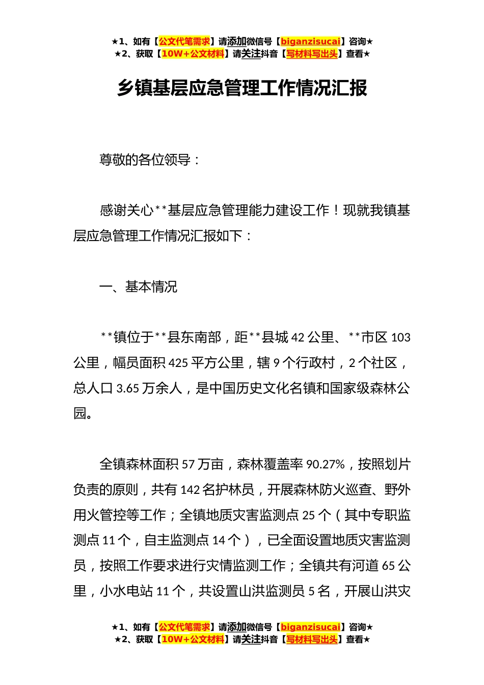 ★1、如有【公文代笔需求】请添加微信号【biganzisucai】咨询★★2、获取【10W+公文材料】请关注抖音【写材料写出头】查看★乡镇基层应急管理工作情况汇报尊敬的各位领导:感谢关心**基层应急管理能力建设工作!现就我镇基层应急管理工作情况汇报如下:一、基本情况**镇位于**县东南部,距**县城42公里、**市区103公里,幅员面积425平方公里,辖9个行政村,2个社区,总人口3.65万余人,是中国历史文化名镇和国家级森林公园。全镇森林面积57万亩,森林覆盖率90.27%,按照划片负责的原则,共有142名护林员,开展森林防火巡查、野外用火管控等工作;全镇地质灾害监测点25个(其中专职监测点11个,自主监测点14个),已全面设置地质灾害监测员,按照工作要求进行灾情监测工作;全镇共有河道65公里,小水电站11个,共设...