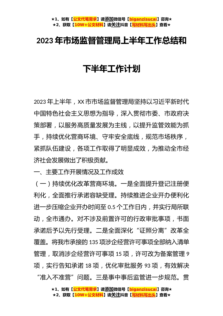 ★1、如有【公文代笔需求】请添加微信号【biganzisucai】咨询★★2、获取【10W+公文材料】请关注抖音【写材料写出头】查看★2023年市场监督管理局上半年工作总结和下半年工作计划2023年上半年,XX市市场监督管理局坚持以习近平新时代中国特色社会主义思想为指导,深入贯彻市委、市政府决策部署,以服务高质量发展为主线,以提升监管效能为抓手,持续优化营商环境、守牢安全底线,规范市场秩序,紧抓队伍建设,各项工作取得了明显成效,为推动全市经济社会发展做出了积极贡献。一、主要工作开展情况及工作成效(一)持续优化改革营商环境。一是全面提升登记注册便利化,全面推行承诺容缺受理。持续推进企业开办便利化进一步压缩企业开办时间至0.5个工作日内,并实行局所联动,全市通办。对不涉及前置许可的行政审批...