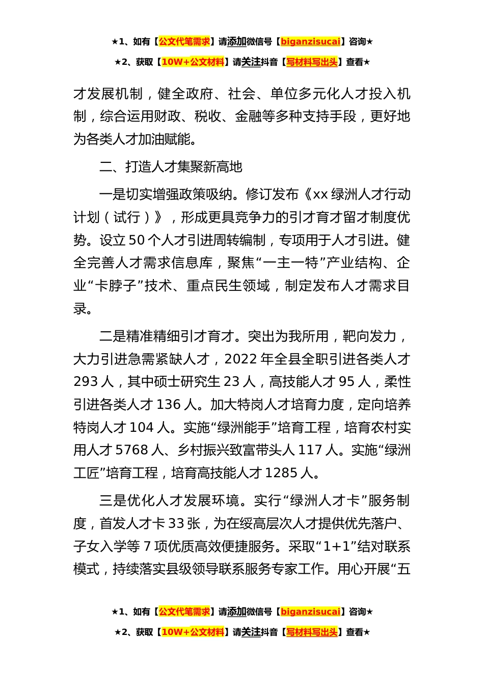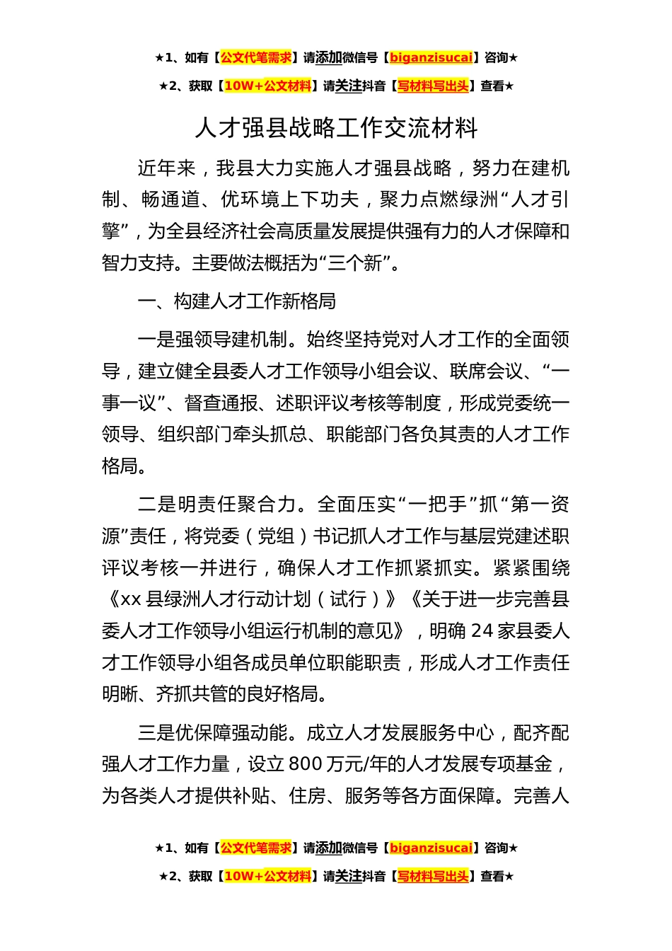 ★1、如有【公文代笔需求】请添加微信号【biganzisucai】咨询★★2、获取【10W+公文材料】请关注抖音【写材料写出头】查看★人才强县战略工作交流材料近年来,我县大力实施人才强县战略,努力在建机“制、畅通道、优环境上下功夫,聚力点燃绿洲人才引”擎,为全县经济社会高质量发展提供强有力的人才保障和“”智力支持。主要做法概括为三个新。一、构建人才工作新格局一是强领导建机制。始终坚持党对人才工作的全面领“导,建立健全县委人才工作领导小组会议、联席会议、一”事一议、督查通报、述职评议考核等制度,形成党委统一领导、组织部门牵头抓总、职能部门各负其责的人才工作格局。“”“二是明责任聚合力。全面压实一把手抓第一资”源责任,将党委(党组)书记抓人才工作与基层党建述职评议考核一并进行...