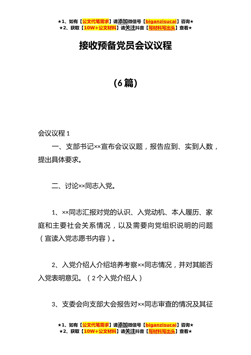 ★1、如有【公文代笔需求】请添加微信号【biganzisucai】咨询★★2、获取【10W+公文材料】请关注抖音【写材料写出头】查看★接收预备党员会议议程(6篇)会议议程1一、支部书记××宣布会议议题,报告应到、实到人数,提出具体要求。二、讨论××同志入党。1、××同志汇报对党的认识、入党动机、本人履历、家庭和主要社会关系情况,以及需要向党组织说明的问题(宣读入党志愿书内容)。2、入党介绍人介绍培养考察××同志情况,并对其能否入党表明意见。(2个入党介绍人)3、支委会向支部大会报告对××同志审查的情况及其征★1、如有【公文代笔需求】请添加微信号【biganzisucai】咨询★★2、获取【10W+公文材料】请关注抖音【写材料写出头】查看★★1、如有【公文代笔需求】请添加微信号【biganzisucai】咨询★...