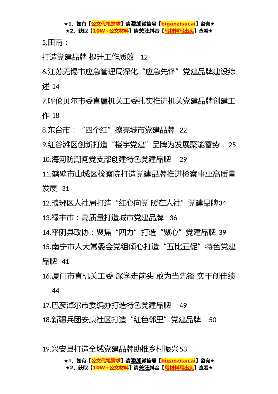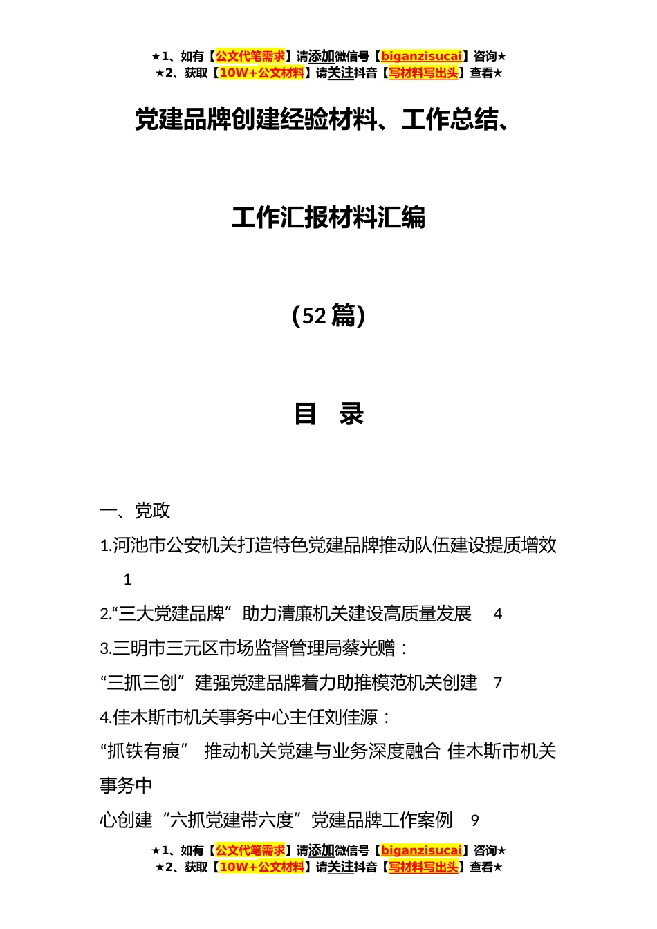 ★1、如有【公文代笔需求】请添加微信号【biganzisucai】咨询★★2、获取【10W+公文材料】请关注抖音【写材料写出头】查看★党建品牌创建经验材料、工作总结、工作汇报材料汇编(52篇)目录一、党政1.河池市公安机关打造特色党建品牌推动队伍建设提质增效12.“三大党建品牌”助力清廉机关建设高质量发展43.三明市三元区市场监督管理局蔡光赠:“三抓三创”建强党建品牌着力助推模范机关创建74.佳木斯市机关事务中心主任刘佳源:“抓铁有痕”推动机关党建与业务深度融合佳木斯市机关事务中心创建“六抓党建带六度”党建品牌工作案例9★1、如有【公文代笔需求】请添加微信号【biganzisucai】咨询★★2、获取【10W+公文材料】请关注抖音【写材料写出头】查看★★1、如有【公文代笔需求】请添加微信号【biganzisucai】...