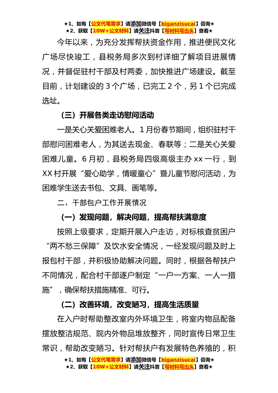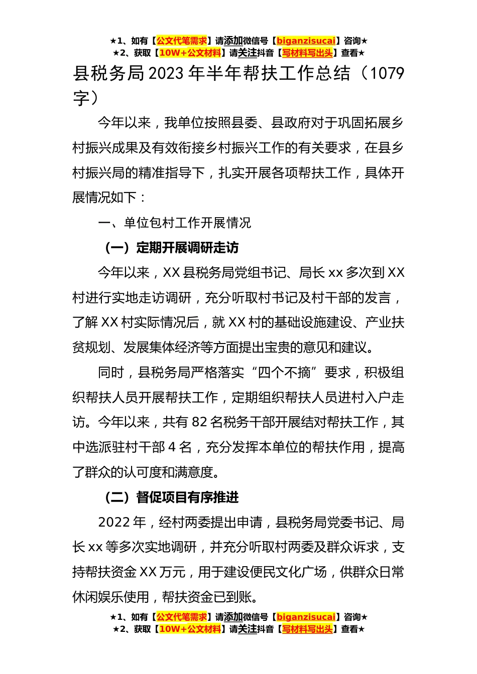 ★1、如有【公文代笔需求】请添加微信号【biganzisucai】咨询★★2、获取【10W+公文材料】请关注抖音【写材料写出头】查看★县税务局2023年半年帮扶工作总结(1079字)今年以来,我单位按照县委、县政府对于巩固拓展乡村振兴成果及有效衔接乡村振兴工作的有关要求,在县乡村振兴局的精准指导下,扎实开展各项帮扶工作,具体开展情况如下:一、单位包村工作开展情况(一)定期开展调研走访今年以来,XX县税务局党组书记、局长xx多次到XX村进行实地走访调研,充分听取村书记及村干部的发言,了解XX村实际情况后,就XX村的基础设施建设、产业扶贫规划、发展集体经济等方面提出宝贵的意见和建议。同时,县税务局严格落实“四个不摘”要求,积极组织帮扶人员开展帮扶工作,定期组织帮扶人员进村入户走访。今年以来,共...