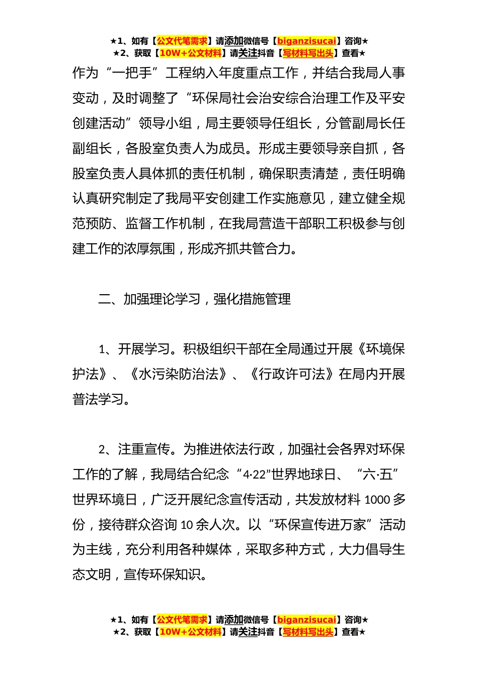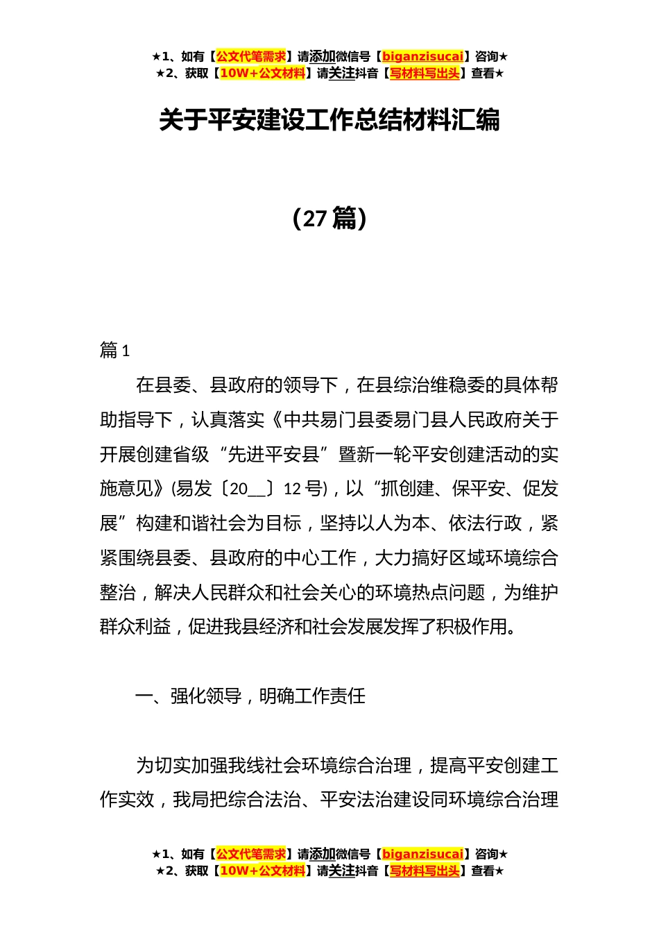 ★1、如有【公文代笔需求】请添加微信号【biganzisucai】咨询★★2、获取【10W+公文材料】请关注抖音【写材料写出头】查看★关于平安建设工作总结材料汇编(27篇)篇1在县委、县政府的领导下,在县综治维稳委的具体帮助指导下,认真落实《中共易门县委易门县人民政府关于开展创建省级“先进平安县”暨新一轮平安创建活动的实施意见》(易发〔20__〕12号),以“抓创建、保平安、促发展”构建和谐社会为目标,坚持以人为本、依法行政,紧紧围绕县委、县政府的中心工作,大力搞好区域环境综合整治,解决人民群众和社会关心的环境热点问题,为维护群众利益,促进我县经济和社会发展发挥了积极作用。一、强化领导,明确工作责任为切实加强我线社会环境综合治理,提高平安创建工作实效,我局把综合法治、平安法治建设同环...