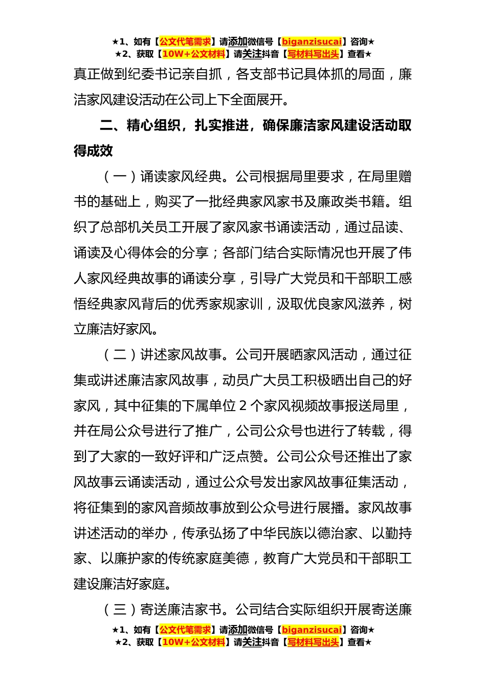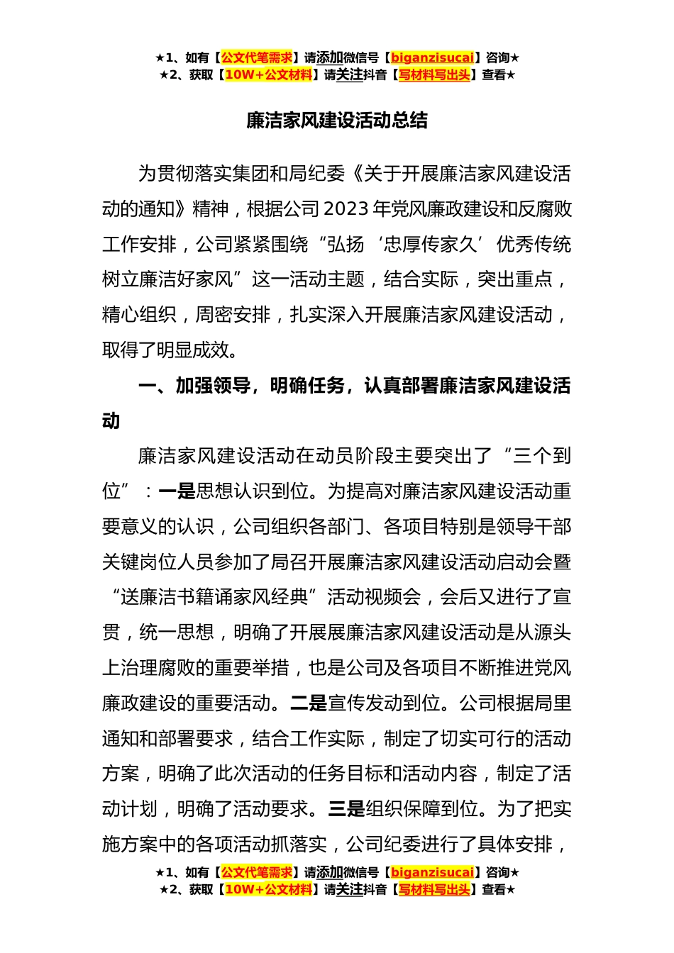 ★1、如有【公文代笔需求】请添加微信号【biganzisucai】咨询★★2、获取【10W+公文材料】请关注抖音【写材料写出头】查看★廉洁家风建设活动总结为贯彻落实集团和局纪委《关于开展廉洁家风建设活动的通知》精神,根据公司2023年党风廉政建设和反腐败工作安排,公司紧紧围绕“弘扬‘忠厚传家久’优秀传统树立廉洁好家风”这一活动主题,结合实际,突出重点,精心组织,周密安排,扎实深入开展廉洁家风建设活动,取得了明显成效。一、加强领导,明确任务,认真部署廉洁家风建设活动廉洁家风建设活动在动员阶段主要突出了“三个到位”:一是思想认识到位。为提高对廉洁家风建设活动重要意义的认识,公司组织各部门、各项目特别是领导干部关键岗位人员参加了局召开展廉洁家风建设活动启动会暨“送廉洁书籍诵家风经典...