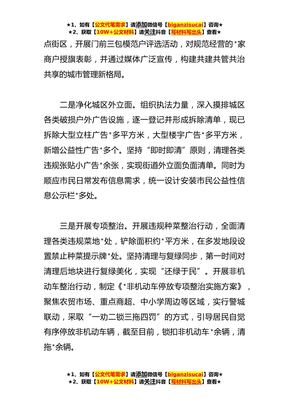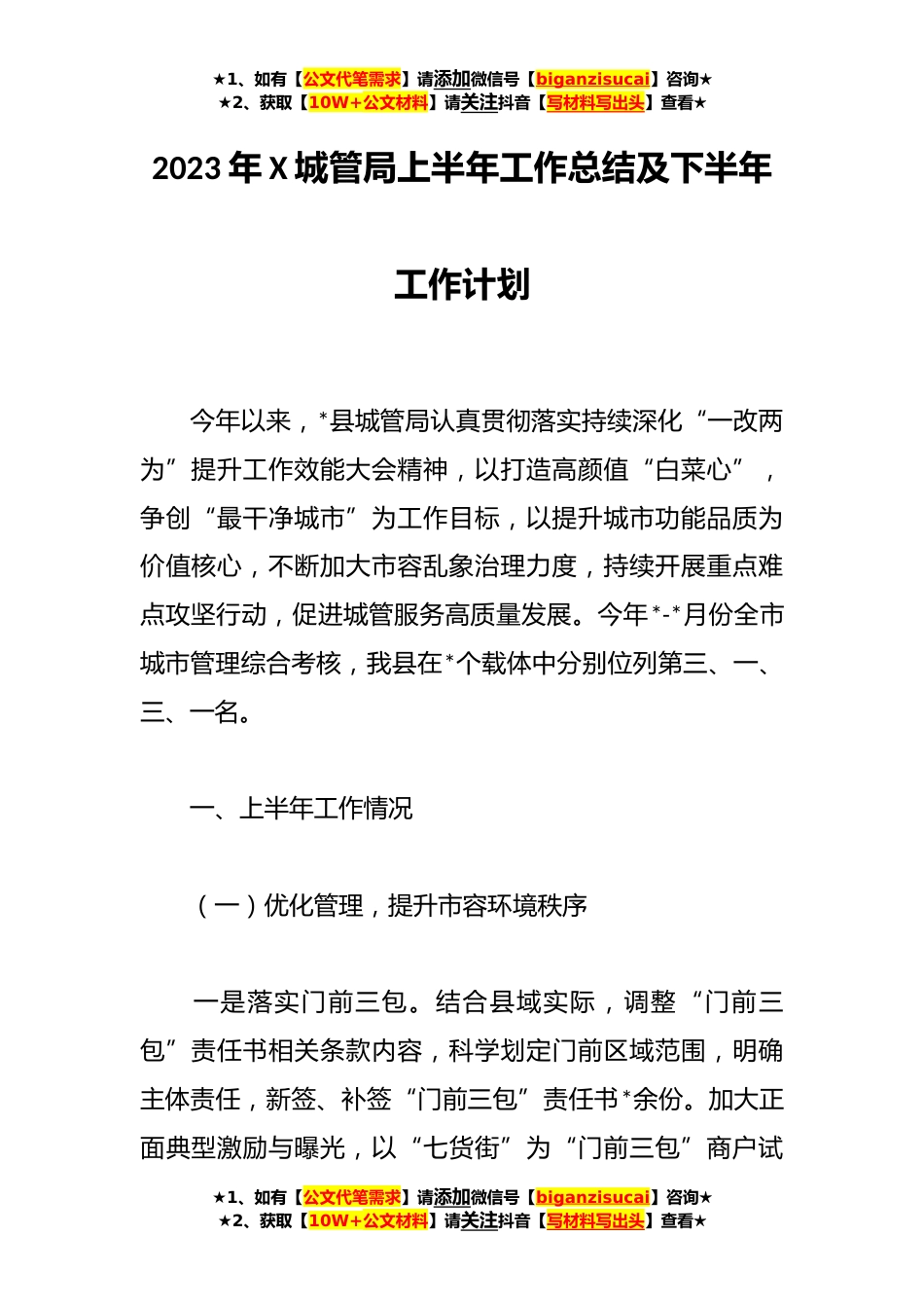 ★1、如有【公文代笔需求】请添加微信号【biganzisucai】咨询★★2、获取【10W+公文材料】请关注抖音【写材料写出头】查看★2023年X城管局上半年工作总结及下半年工作计划今年以来,*县城管局认真贯彻落实持续深化“一改两为”提升工作效能大会精神,以打造高颜值“白菜心”,争创“最干净城市”为工作目标,以提升城市功能品质为价值核心,不断加大市容乱象治理力度,持续开展重点难点攻坚行动,促进城管服务高质量发展。今年*-*月份全市城市管理综合考核,我县在*个载体中分别位列第三、一、三、一名。一、上半年工作情况(一)优化管理,提升市容环境秩序一是落实门前三包。结合县域实际,调整“门前三包”责任书相关条款内容,科学划定门前区域范围,明确主体责任,新签、补签“门前三包”责任书*余份。加大正...