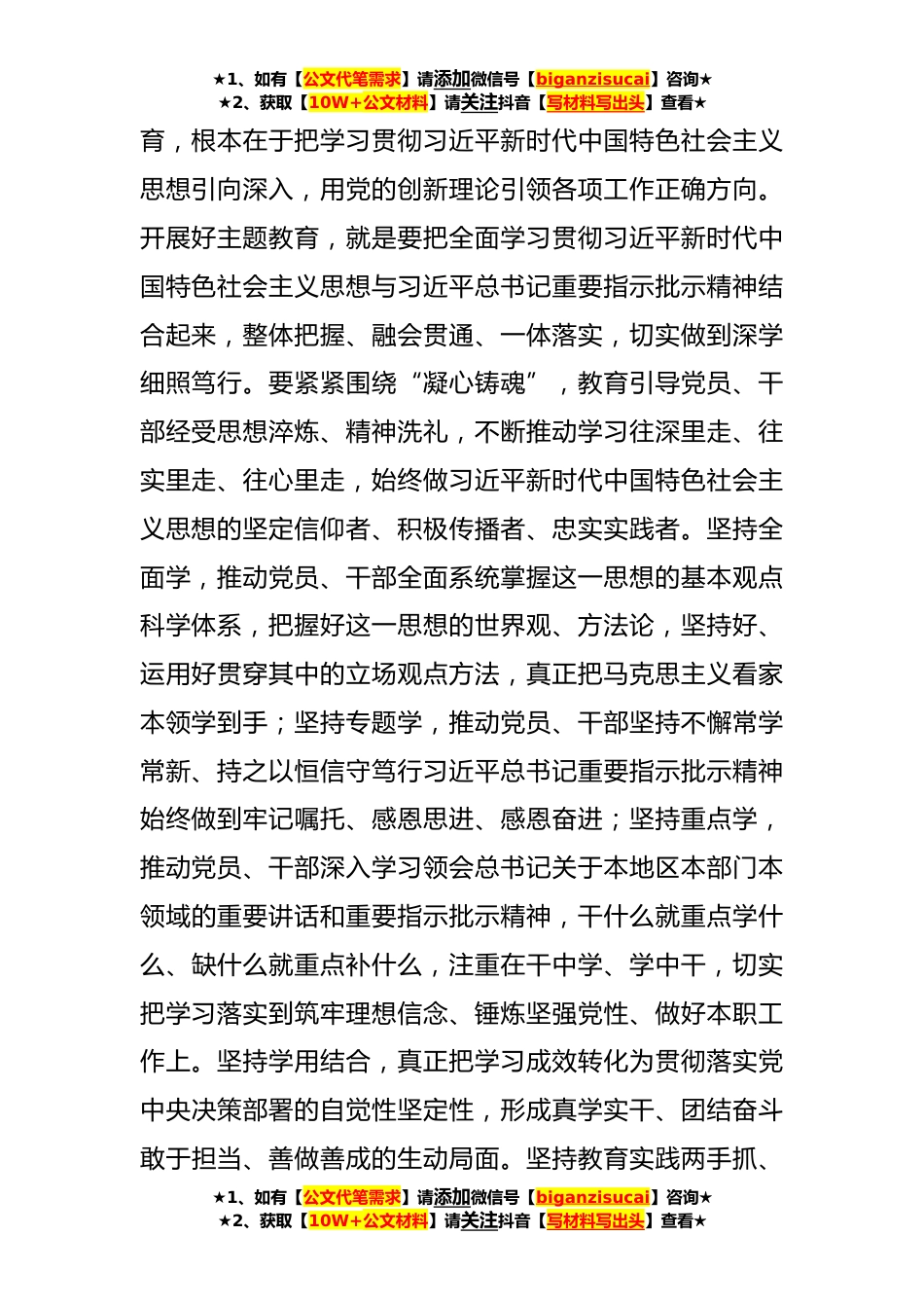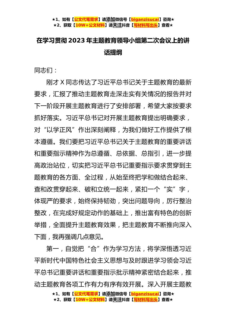 ★1、如有【公文代笔需求】请添加微信号【biganzisucai】咨询★★2、获取【10W+公文材料】请关注抖音【写材料写出头】查看★在学习贯彻2023年主题教育领导小组第二次会议上的讲话提纲同志们:刚才X同志传达了习近平总书记关于主题教育的最新要求,汇报了推动主题教育走深走实有关情况的报告并对下一阶段开展主题教育进行了安排部署,希望大家按要求抓好落实。习近平总书记对开展主题教育提出明确要求,对“以学正风”作出深刻阐释,为我们做好工作提供了根本遵循。我们要把习近平总书记关于主题教育的重要讲话和重要指示精神作为总遵循、总依据、总指引,进一步提高政治站位,切实把习近平总书记重要指示要求贯穿到主题教育的各方面、全过程,从始至终把学和做结合起来、查和改贯穿起来、破和立统一起来,紧扣一个...