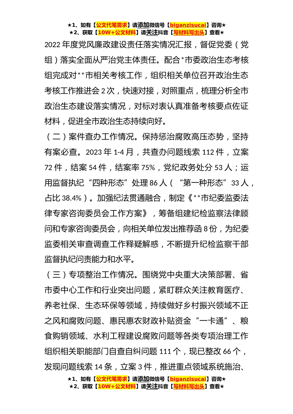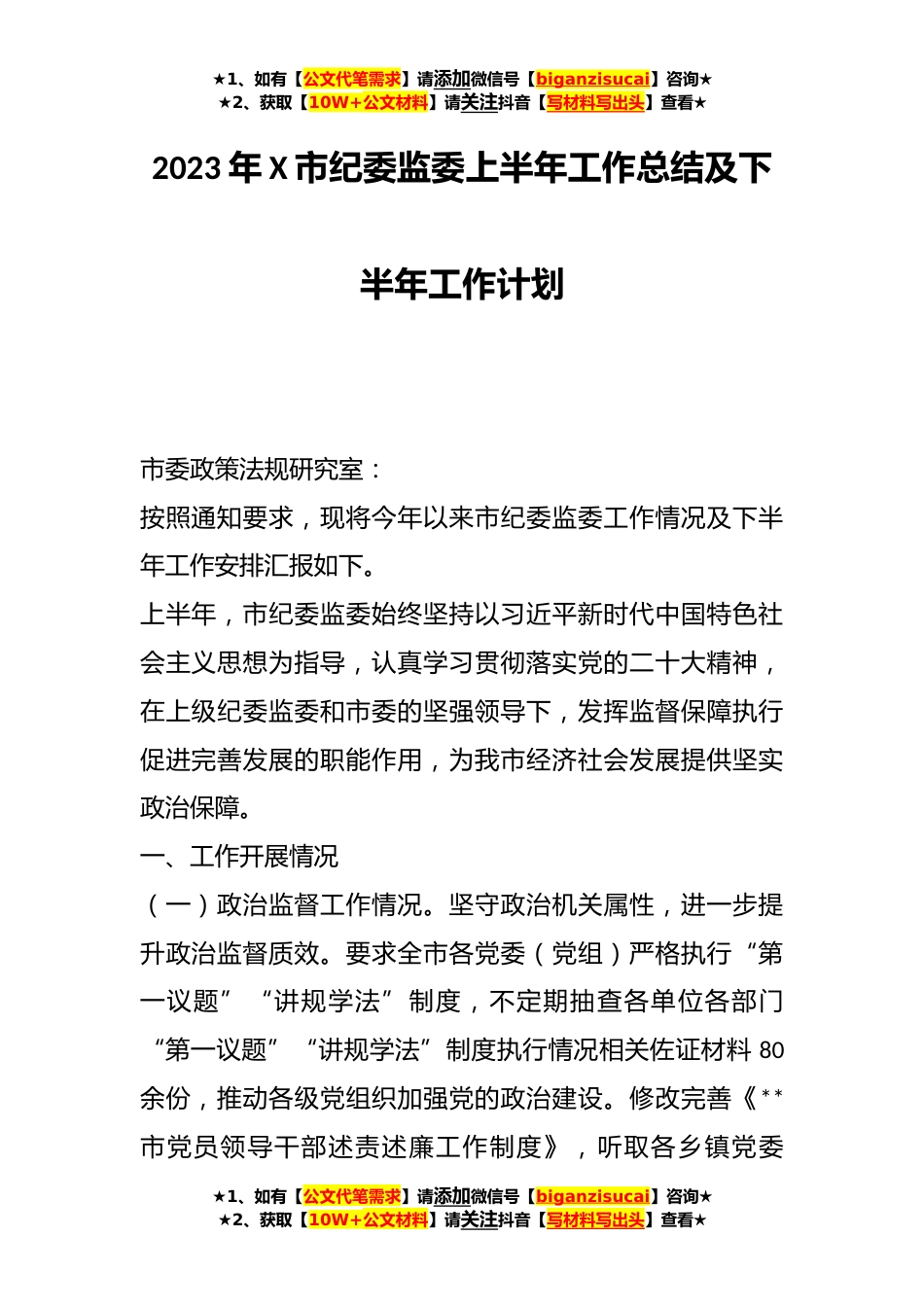 ★1、如有【公文代笔需求】请添加微信号【biganzisucai】咨询★★2、获取【10W+公文材料】请关注抖音【写材料写出头】查看★2023年X市纪委监委上半年工作总结及下半年工作计划市委政策法规研究室:按照通知要求,现将今年以来市纪委监委工作情况及下半年工作安排汇报如下。上半年,市纪委监委始终坚持以习近平新时代中国特色社会主义思想为指导,认真学习贯彻落实党的二十大精神,在上级纪委监委和市委的坚强领导下,发挥监督保障执行促进完善发展的职能作用,为我市经济社会发展提供坚实政治保障。一、工作开展情况(一)政治监督工作情况。坚守政治机关属性,进一步提升政治监督质效。要求全市各党委(党组)严格执行“第一议题”“讲规学法”制度,不定期抽查各单位各部门“第一议题”“讲规学法”制度执行情况...