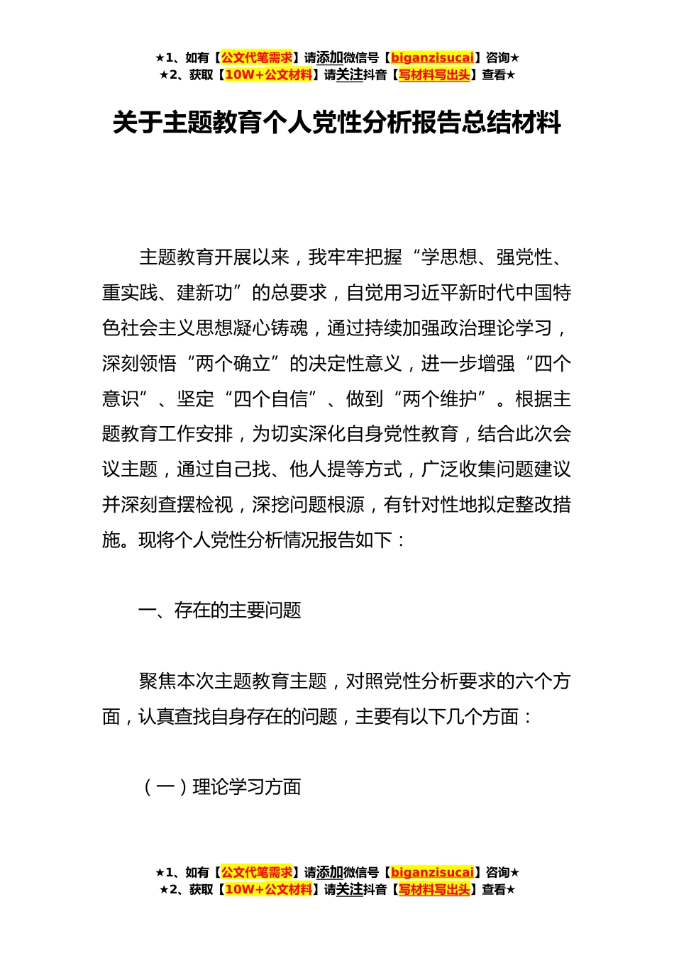 ★1、如有【公文代笔需求】请添加微信号【biganzisucai】咨询★★2、获取【10W+公文材料】请关注抖音【写材料写出头】查看★关于主题教育个人党性分析报告总结材料主题教育开展以来,我牢牢把握“学思想、强党性、重实践、建新功”的总要求,自觉用习近平新时代中国特色社会主义思想凝心铸魂,通过持续加强政治理论学习,深刻领悟“两个确立”的决定性意义,进一步增强“四个意识”、坚定“四个自信”、做到“两个维护”。根据主题教育工作安排,为切实深化自身党性教育,结合此次会议主题,通过自己找、他人提等方式,广泛收集问题建议并深刻查摆检视,深挖问题根源,有针对性地拟定整改措施。现将个人党性分析情况报告如下:一、存在的主要问题聚焦本次主题教育主题,对照党性分析要求的六个方面,认真查找自身...