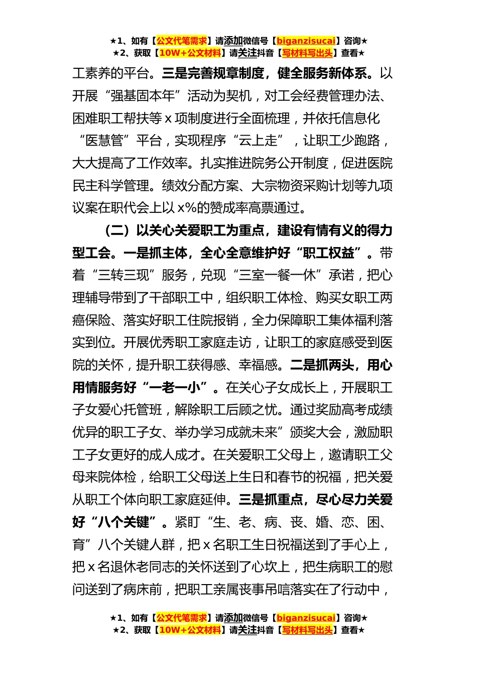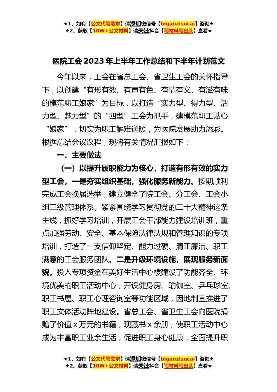 ★1、如有【公文代笔需求】请添加微信号【biganzisucai】咨询★★2、获取【10W+公文材料】请关注抖音【写材料写出头】查看★医院工会2023年上半年工作总结和下半年计划范文今年以来,工会在省总工会、省卫生工会的关怀指导下,以创建“有形有效、有声有色、有情有义、有滋有味的模范职工娘家”为目标,以打造“实力型、得力型、活力型、魅力型”的“四型”工会为抓手,建模范职工贴心“娘家”,切实为职工解难送暖,为医院发展助力添彩。根据总结会议议程,现将有关情况汇报如下:一、主要做法(一)以提升履职能力为核心,打造有形有效的实力型工会。一是夯实组织基础,强化服务新能力。按期顺利完成工会换届选举,建立健全了院工会、分工会、工会小组三级管理体系。紧紧围绕学习贯彻党的二十大精神这条主线,抓...