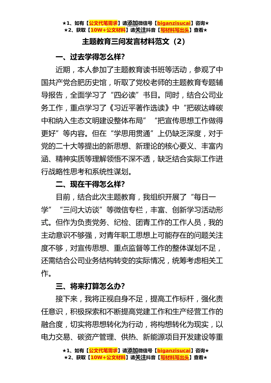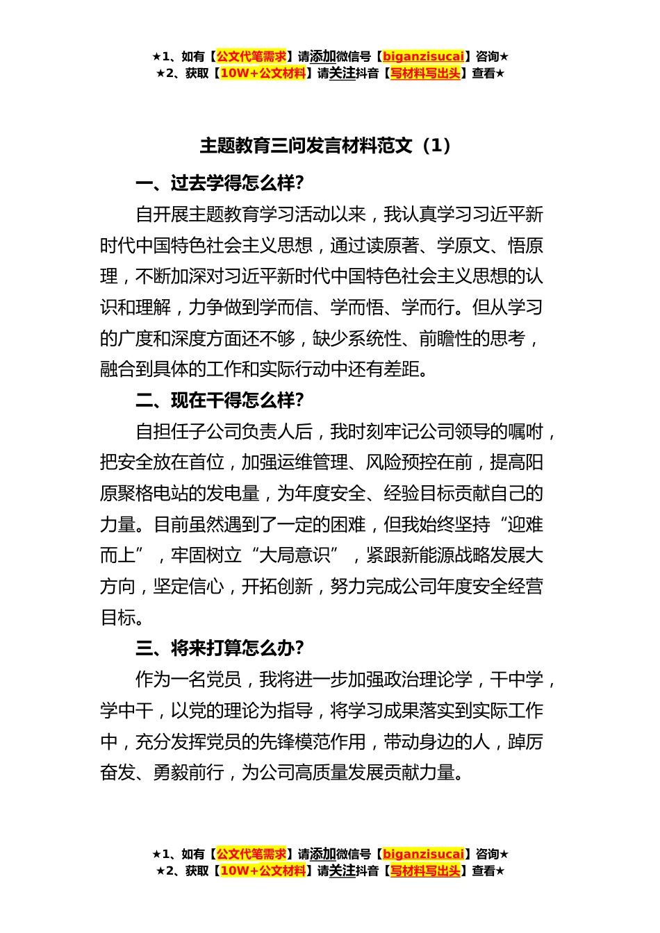 ★1、如有【公文代笔需求】请添加微信号【biganzisucai】咨询★★2、获取【10W+公文材料】请关注抖音【写材料写出头】查看★主题教育三问发言材料范文(1)一、过去学得怎么样?自开展主题教育学习活动以来,我认真学习习近平新时代中国特色社会主义思想,通过读原著、学原文、悟原理,不断加深对习近平新时代中国特色社会主义思想的认识和理解,力争做到学而信、学而悟、学而行。但从学习的广度和深度方面还不够,缺少系统性、前瞻性的思考,融合到具体的工作和实际行动中还有差距。二、现在干得怎么样?自担任子公司负责人后,我时刻牢记公司领导的嘱咐,把安全放在首位,加强运维管理、风险预控在前,提高阳原聚格电站的发电量,为年度安全、经验目标贡献自己的力量。目前虽然遇到了一定的困难,但我始终坚持“...