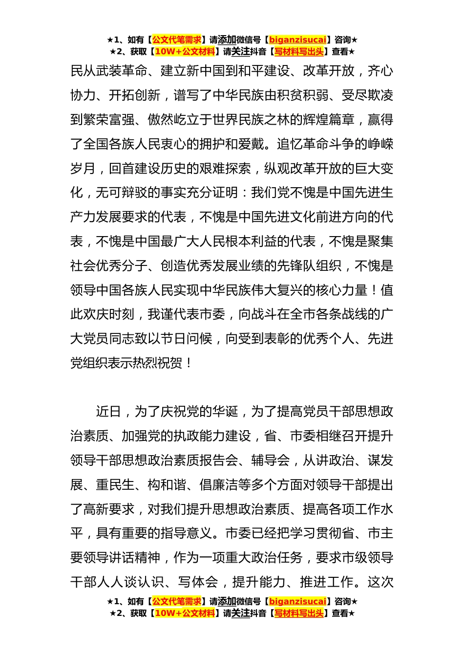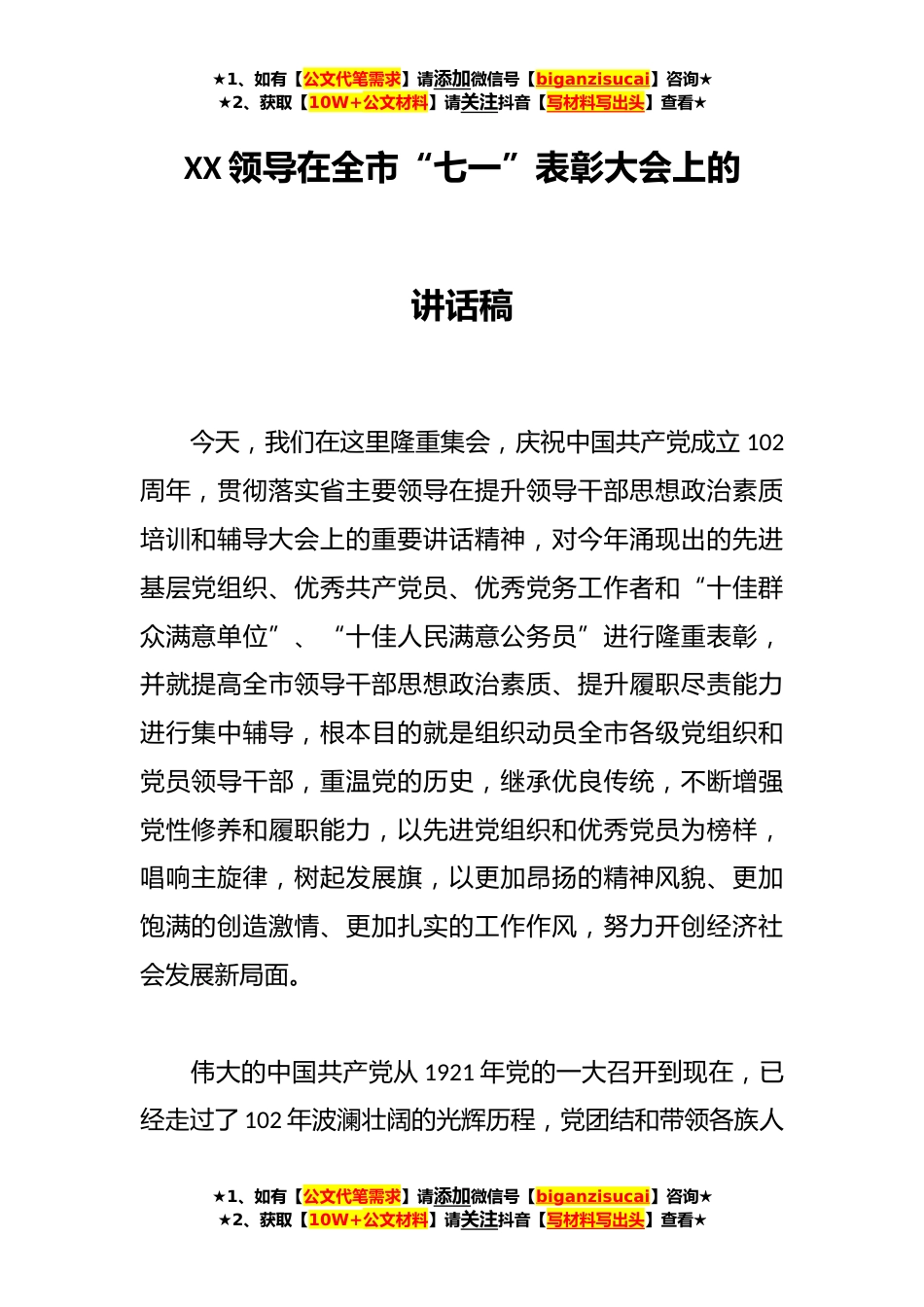 ★1、如有【公文代笔需求】请添加微信号【biganzisucai】咨询★★2、获取【10W+公文材料】请关注抖音【写材料写出头】查看★XX领导在全市“七一”表彰大会上的讲话稿今天,我们在这里隆重集会,庆祝中国共产党成立102周年,贯彻落实省主要领导在提升领导干部思想政治素质培训和辅导大会上的重要讲话精神,对今年涌现出的先进基层党组织、优秀共产党员、优秀党务工作者和“十佳群众满意单位”、“十佳人民满意公务员”进行隆重表彰,并就提高全市领导干部思想政治素质、提升履职尽责能力进行集中辅导,根本目的就是组织动员全市各级党组织和党员领导干部,重温党的历史,继承优良传统,不断增强党性修养和履职能力,以先进党组织和优秀党员为榜样,唱响主旋律,树起发展旗,以更加昂扬的精神风貌、更加饱满的创造激...