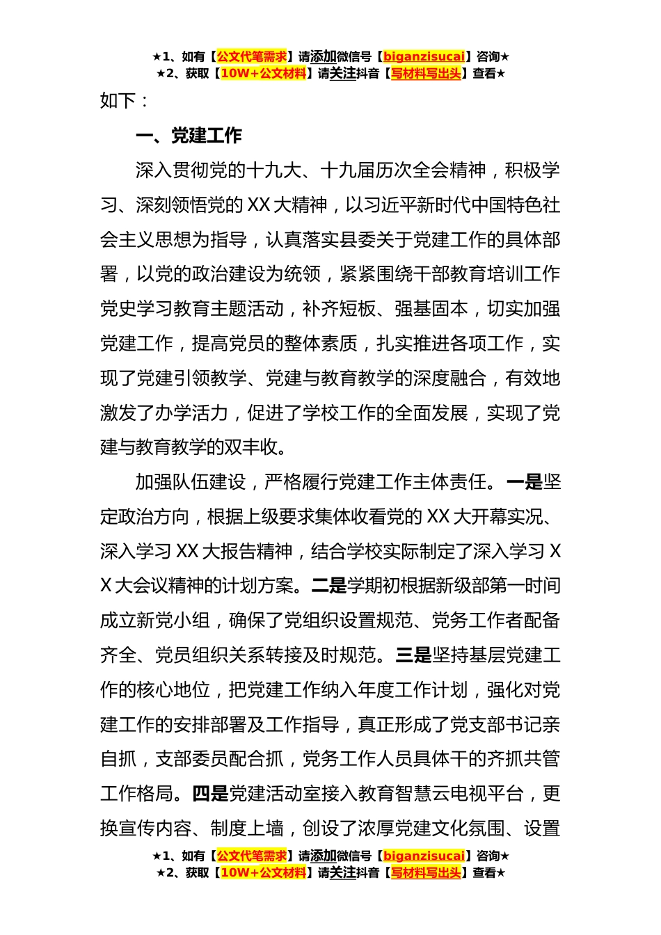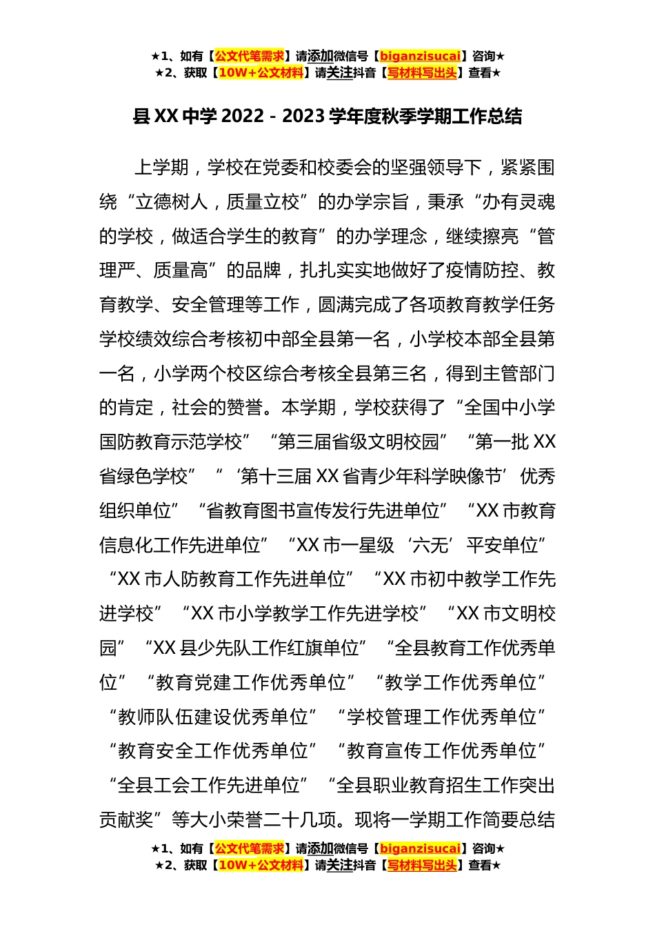 ★1、如有【公文代笔需求】请添加微信号【biganzisucai】咨询★★2、获取【10W+公文材料】请关注抖音【写材料写出头】查看★县XX中学2022-2023学年度秋季学期工作总结上学期,学校在党委和校委会的坚强领导下,紧紧围绕“立德树人,质量立校”的办学宗旨,秉承“办有灵魂的学校,做适合学生的教育”的办学理念,继续擦亮“管理严、质量高”的品牌,扎扎实实地做好了疫情防控、教育教学、安全管理等工作,圆满完成了各项教育教学任务学校绩效综合考核初中部全县第一名,小学校本部全县第一名,小学两个校区综合考核全县第三名,得到主管部门的肯定,社会的赞誉。本学期,学校获得了“全国中小学国防教育示范学校”“第三届省级文明校园”“第一批XX省绿色学校”“‘第十三届XX省青少年科学映像节’优秀组织单位”...