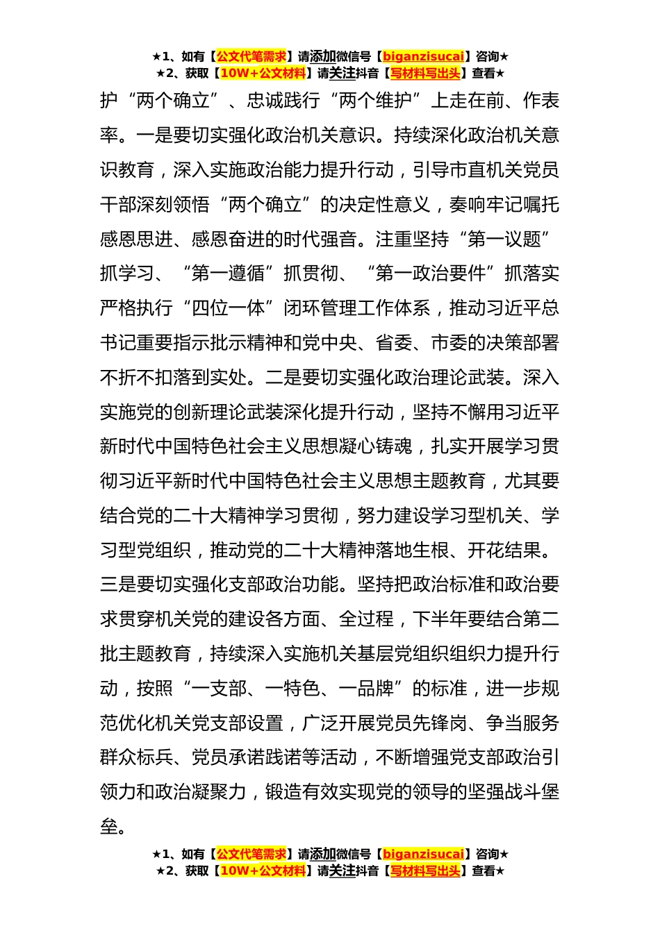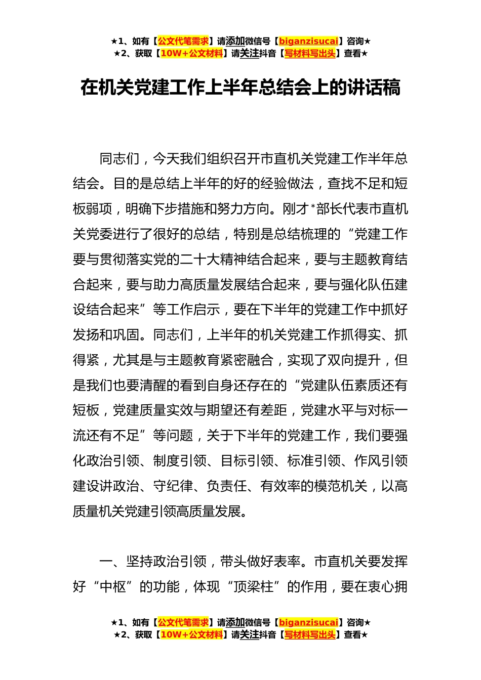 ★1、如有【公文代笔需求】请添加微信号【biganzisucai】咨询★★2、获取【10W+公文材料】请关注抖音【写材料写出头】查看★在机关党建工作上半年总结会上的讲话稿同志们,今天我们组织召开市直机关党建工作半年总结会。目的是总结上半年的好的经验做法,查找不足和短板弱项,明确下步措施和努力方向。刚才*部长代表市直机关党委进行了很好的总结,特别是总结梳理的“党建工作要与贯彻落实党的二十大精神结合起来,要与主题教育结合起来,要与助力高质量发展结合起来,要与强化队伍建设结合起来”等工作启示,要在下半年的党建工作中抓好发扬和巩固。同志们,上半年的机关党建工作抓得实、抓得紧,尤其是与主题教育紧密融合,实现了双向提升,但是我们也要清醒的看到自身还存在的“党建队伍素质还有短板,党建质量...