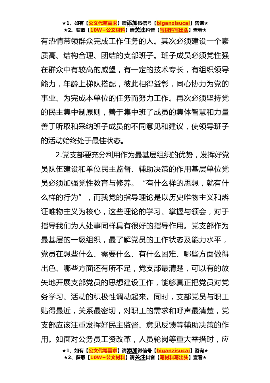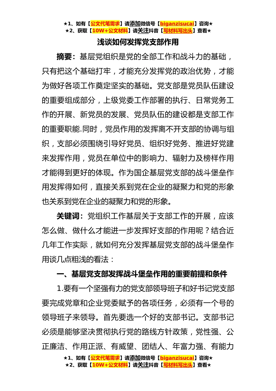 ★1、如有【公文代笔需求】请添加微信号【biganzisucai】咨询★★2、获取【10W+公文材料】请关注抖音【写材料写出头】查看★浅谈如何发挥党支部作用摘要:基层党组织是党的全部工作和战斗力的基础,只有把这个基础打牢,才能充分发挥党的政治优势,才能为做好各项工作奠定坚实的基础。党支部是党员队伍建设的重要组成部分,上级党委工作部署的执行、日常党务工作的开展、新党员的发展、党员队伍的建设都是支部工作的重要职能.同时,党员作用的发挥离不开支部的协调与组织,支部必须围绕引导好党员、组织好党务、推进好党建来发挥作用,党员在单位中的影响力、辐射力及榜样作用才能得到更好的体现。作为国企基层党支部的战斗堡垒作用发挥得如何,直接关系到党在企业的凝聚力和党的形象也关系到党在企业的凝聚力和党...