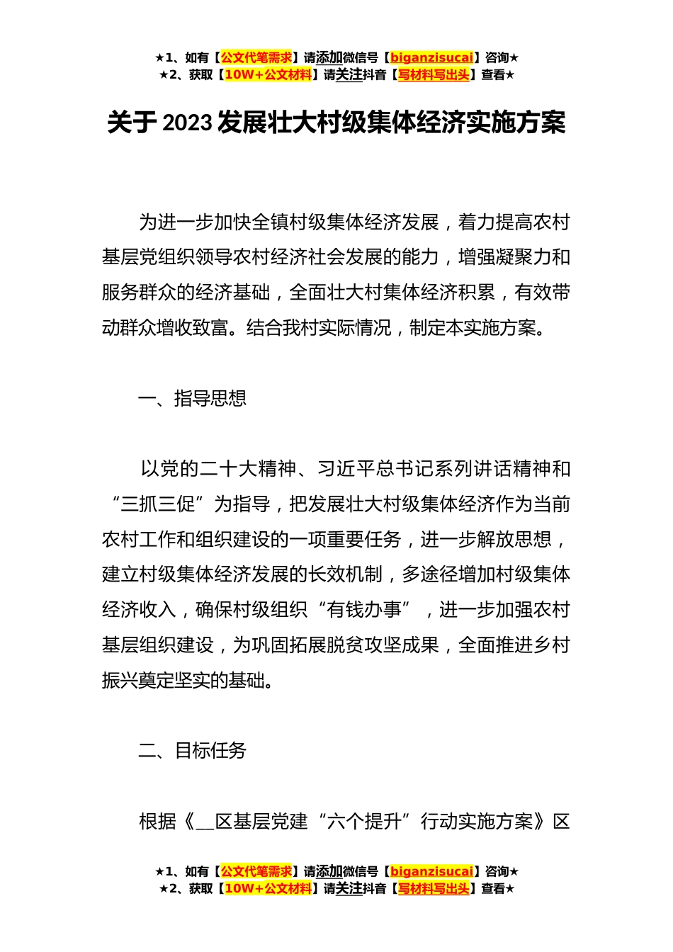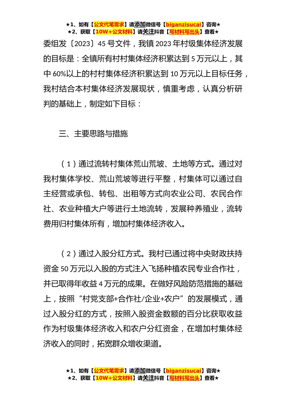 ★1、如有【公文代笔需求】请添加微信号【biganzisucai】咨询★★2、获取【10W+公文材料】请关注抖音【写材料写出头】查看★关于2023发展壮大村级集体经济实施方案为进一步加快全镇村级集体经济发展,着力提高农村基层党组织领导农村经济社会发展的能力,增强凝聚力和服务群众的经济基础,全面壮大村集体经济积累,有效带动群众增收致富。结合我村实际情况,制定本实施方案。一、指导思想以党的二十大精神、习近平总书记系列讲话精神和“三抓三促”为指导,把发展壮大村级集体经济作为当前农村工作和组织建设的一项重要任务,进一步解放思想,建立村级集体经济发展的长效机制,多途径增加村级集体经济收入,确保村级组织“有钱办事”,进一步加强农村基层组织建设,为巩固拓展脱贫攻坚成果,全面推进乡村振兴奠定...