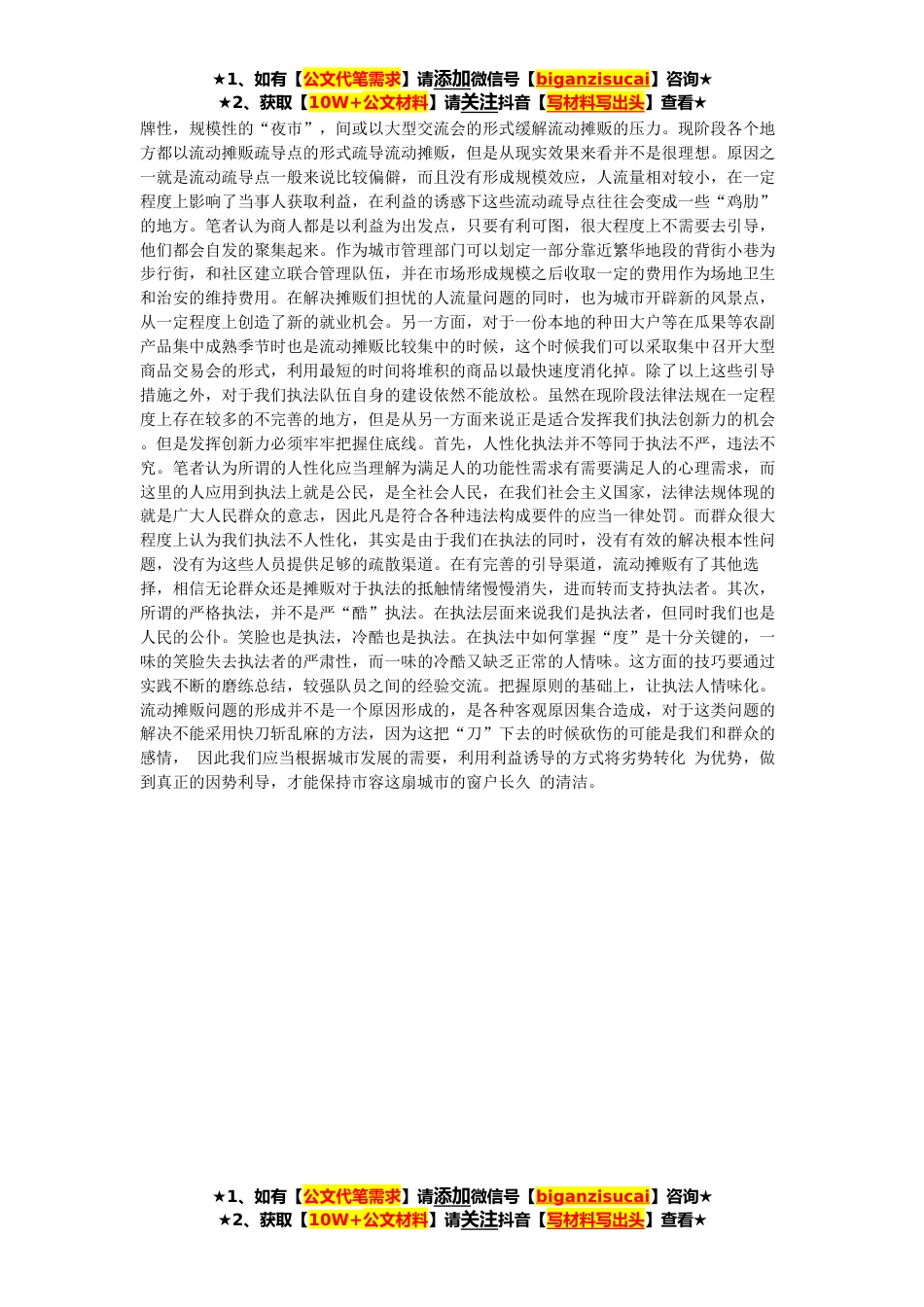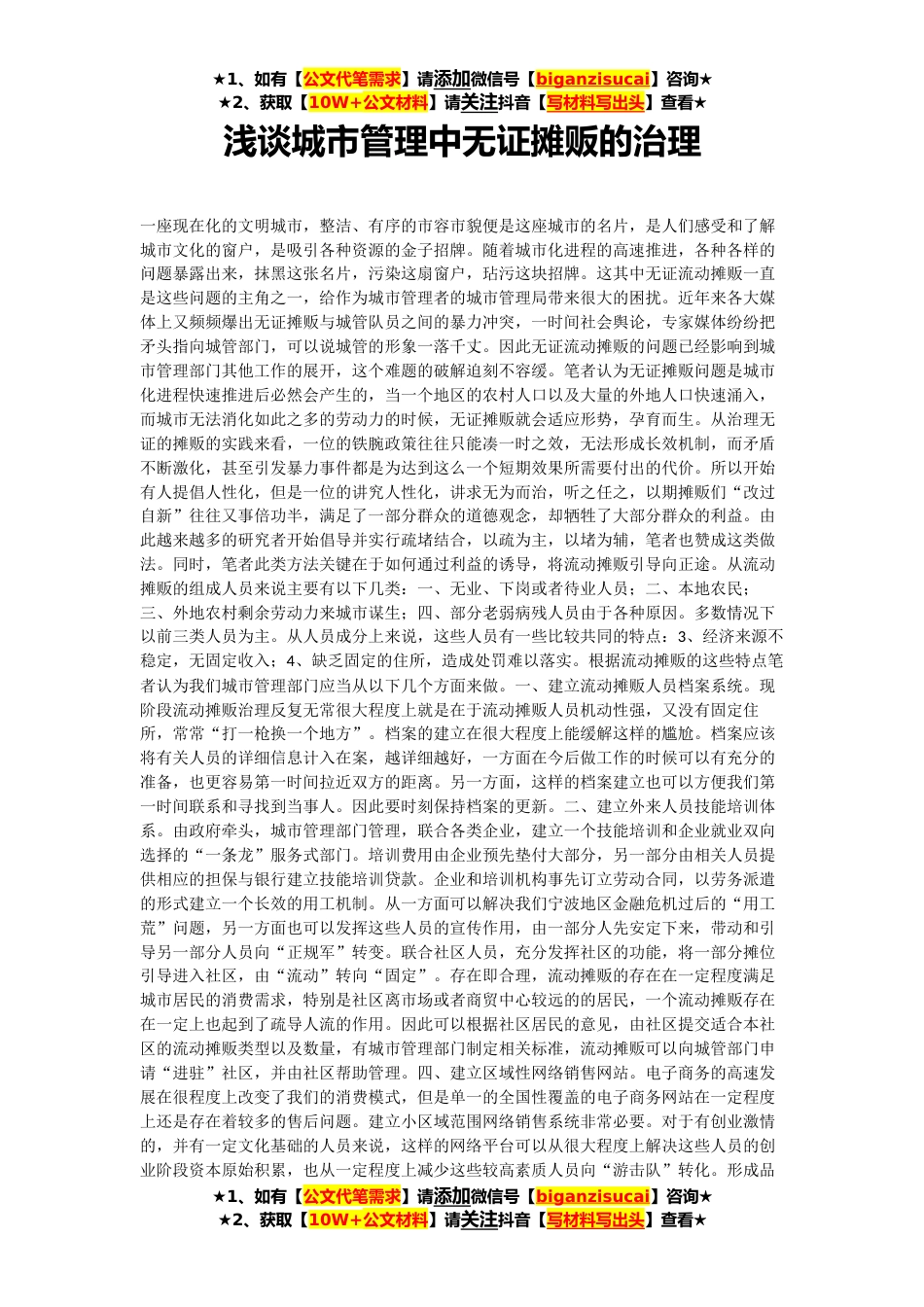 ★1、如有【公文代笔需求】请添加微信号【biganzisucai】咨询★★2、获取【10W+公文材料】请关注抖音【写材料写出头】查看★浅谈城市管理中无证摊贩的治理一座现在化的文明城市,整洁、有序的市容市貌便是这座城市的名片,是人们感受和了解城市文化的窗户,是吸引各种资源的金子招牌。随着城市化进程的高速推进,各种各样的问题暴露出来,抹黑这张名片,污染这扇窗户,玷污这块招牌。这其中无证流动摊贩一直是这些问题的主角之一,给作为城市管理者的城市管理局带来很大的困扰。近年来各大媒体上又频频爆出无证摊贩与城管队员之间的暴力冲突,一时间社会舆论,专家媒体纷纷把矛头指向城管部门,可以说城管的形象一落千丈。因此无证流动摊贩的问题已经影响到城市管理部门其他工作的展开,这个难题的破解迫刻不容缓...
