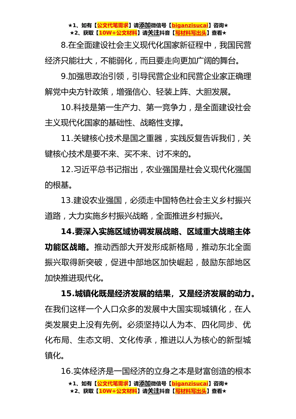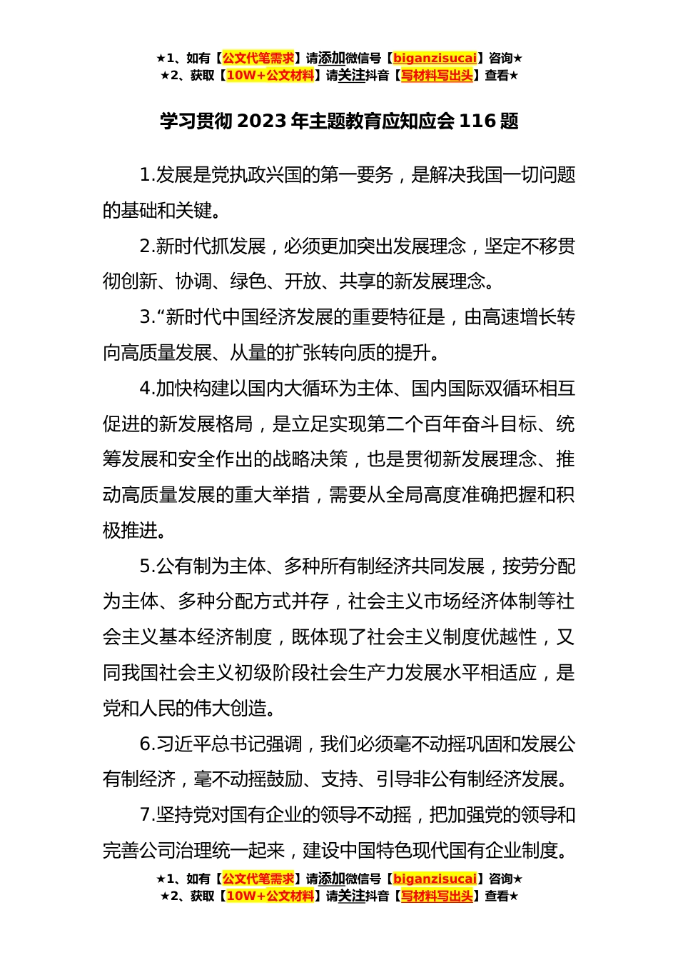★1、如有【公文代笔需求】请添加微信号【biganzisucai】咨询★★2、获取【10W+公文材料】请关注抖音【写材料写出头】查看★学习贯彻2023年主题教育应知应会116题1.发展是党执政兴国的第一要务,是解决我国一切问题的基础和关键。2.新时代抓发展,必须更加突出发展理念,坚定不移贯彻创新、协调、绿色、开放、共享的新发展理念。3.“新时代中国经济发展的重要特征是,由高速增长转向高质量发展、从量的扩张转向质的提升。4.加快构建以国内大循环为主体、国内国际双循环相互促进的新发展格局,是立足实现第二个百年奋斗目标、统筹发展和安全作出的战略决策,也是贯彻新发展理念、推动高质量发展的重大举措,需要从全局高度准确把握和积极推进。5.公有制为主体、多种所有制经济共同发展,按劳分配为主体、多种分配方...