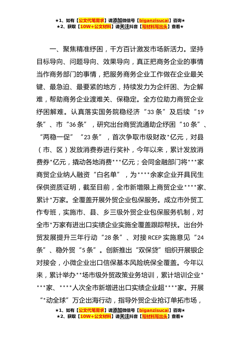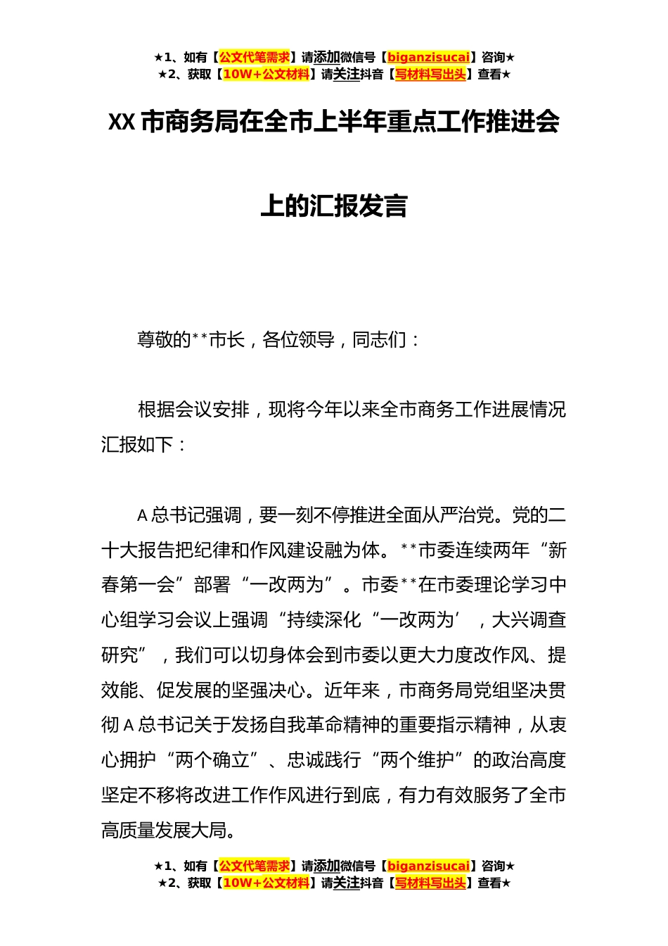 ★1、如有【公文代笔需求】请添加微信号【biganzisucai】咨询★★2、获取【10W+公文材料】请关注抖音【写材料写出头】查看★XX市商务局在全市上半年重点工作推进会上的汇报发言尊敬的**市长,各位领导,同志们:根据会议安排,现将今年以来全市商务工作进展情况汇报如下:A总书记强调,要一刻不停推进全面从严治党。党的二十大报告把纪律和作风建设融为体。**市委连续两年“新春第一会”部署“一改两为”。市委**在市委理论学习中心组学习会议上强调“持续深化“一改两为’,大兴调查研究”,我们可以切身体会到市委以更大力度改作风、提效能、促发展的坚强决心。近年来,市商务局党组坚决贯彻A总书记关于发扬自我革命精神的重要指示精神,从衷心拥护“两个确立”、忠诚践行“两个维护”的政治高度坚定不移将改进...