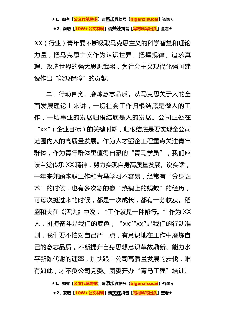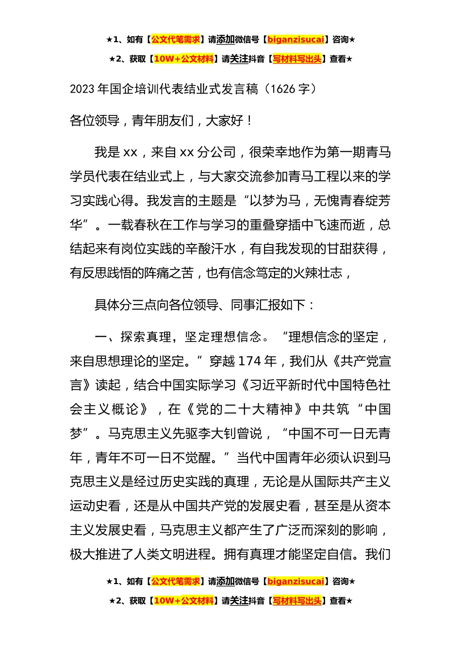 ★1、如有【公文代笔需求】请添加微信号【biganzisucai】咨询★★2、获取【10W+公文材料】请关注抖音【写材料写出头】查看★2023年国企培训代表结业式发言稿(1626字)各位领导,青年朋友们,大家好!我是xx,来自xx分公司,很荣幸地作为第一期青马学员代表在结业式上,与大家交流参加青马工程以来的学习实践心得。我发言的主题是“以梦为马,无愧青春绽芳华”。一载春秋在工作与学习的重叠穿插中飞速而逝,总结起来有岗位实践的辛酸汗水,有自我发现的甘甜获得,有反思践悟的阵痛之苦,也有信念笃定的火辣壮志,具体分三点向各位领导、同事汇报如下:一、探索真理,坚定理想信念。“理想信念的坚定,来自思想理论的坚定。”穿越174年,我们从《共产党宣言》读起,结合中国实际学习《习近平新时代中国特色社会主义...