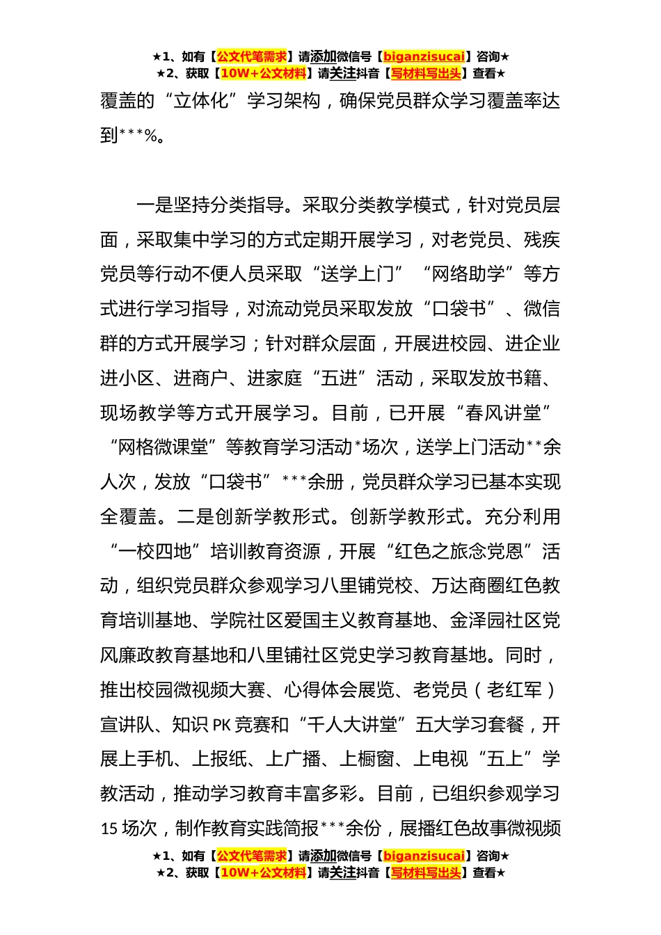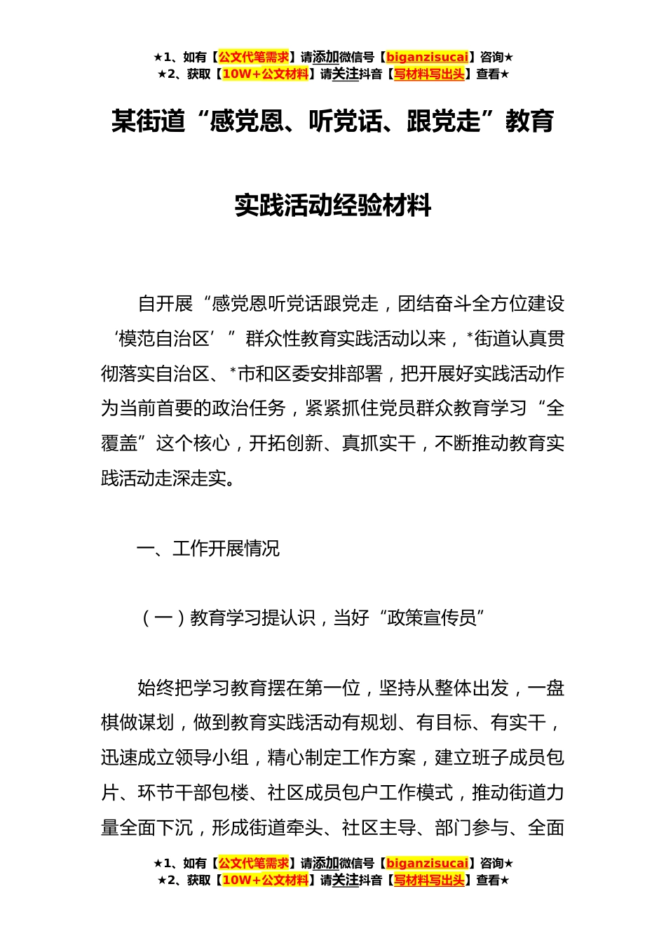 ★1、如有【公文代笔需求】请添加微信号【biganzisucai】咨询★★2、获取【10W+公文材料】请关注抖音【写材料写出头】查看★某街道“感党恩、听党话、跟党走”教育实践活动经验材料自开展“感党恩听党话跟党走,团结奋斗全方位建设‘模范自治区’”群众性教育实践活动以来,*街道认真贯彻落实自治区、*市和区委安排部署,把开展好实践活动作为当前首要的政治任务,紧紧抓住党员群众教育学习“全覆盖”这个核心,开拓创新、真抓实干,不断推动教育实践活动走深走实。一、工作开展情况(一)教育学习提认识,当好“政策宣传员”始终把学习教育摆在第一位,坚持从整体出发,一盘棋做谋划,做到教育实践活动有规划、有目标、有实干,迅速成立领导小组,精心制定工作方案,建立班子成员包片、环节干部包楼、社区成员包...