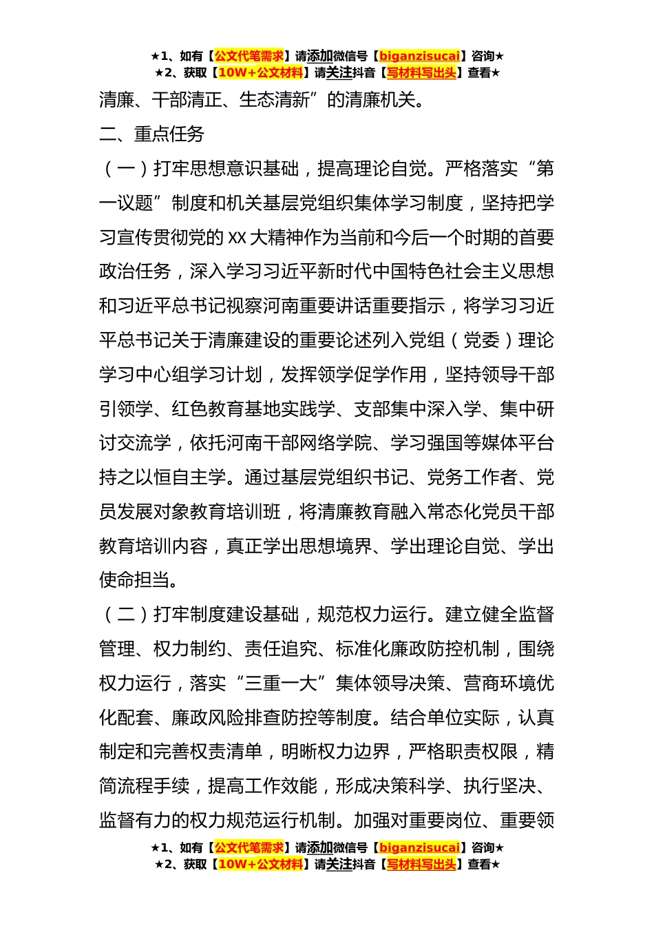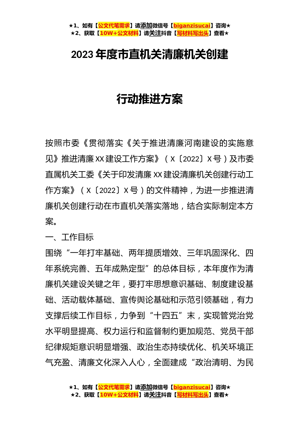 ★1、如有【公文代笔需求】请添加微信号【biganzisucai】咨询★★2、获取【10W+公文材料】请关注抖音【写材料写出头】查看★2023年度市直机关清廉机关创建行动推进方案按照市委《贯彻落实《关于推进清廉河南建设的实施意见》推进清廉XX建设工作方案》(X〔2022〕X号)及市委直属机关工委《关于印发清廉XX建设清廉机关创建行动工作方案》(X〔2022〕X号)的文件精神,为进一步推进清廉机关创建行动在市直机关落实落地,结合实际制定本方案。一、工作目标围绕“一年打牢基础、两年提质增效、三年巩固深化、四年系统完善、五年成熟定型”的总体目标,本年度作为清廉机关建设关键之年,要打牢思想意识基础、制度建设基础、活动载体基础、宣传舆论基础和示范引领基础,有力支撑后续工作目标,力争到“十四五”末,实现...