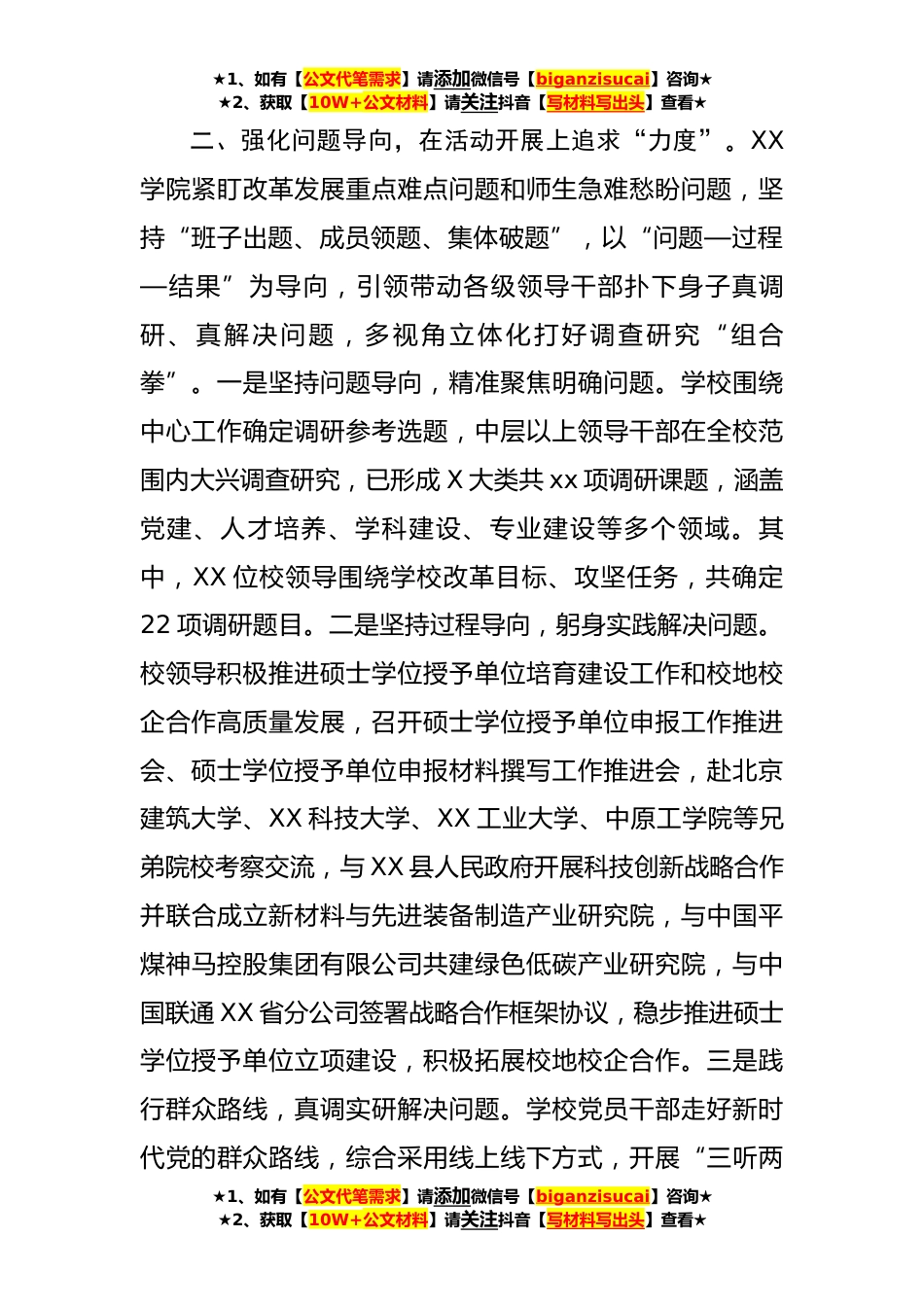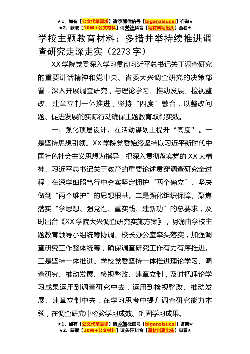 ★1、如有【公文代笔需求】请添加微信号【biganzisucai】咨询★★2、获取【10W+公文材料】请关注抖音【写材料写出头】查看★学校主题教育材料:多措并举持续推进调查研究走深走实(2273字)XX学院党委深入学习贯彻习近平总书记关于调查研究的重要讲话精神和党中央、省委大兴调查研究的决策部署,深入开展调查研究,与理论学习、推动发展、检视整改、建章立制一体推进,坚持“四度”融合,以整改问题、促进发展的实际行动确保主题教育取得实效。一、强化顶层设计,在活动谋划上提升“高度”。一是坚持思想引领。XX学院党委始终坚持以习近平新时代中国特色社会主义思想为指导,把深入贯彻落实党的XX大精神、习近平总书记关于教育的重要论述贯穿调查研究全过程,在深学细照笃行中夯实坚定拥护“两个确立”、坚决做到...