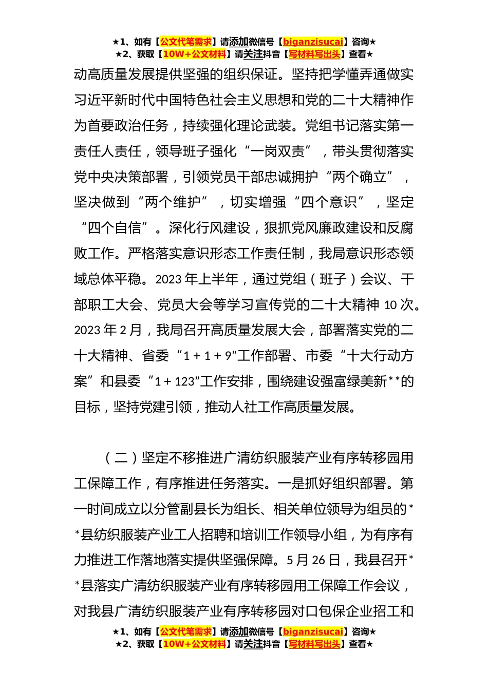 ★1、如有【公文代笔需求】请添加微信号【biganzisucai】咨询★★2、获取【10W+公文材料】请关注抖音【写材料写出头】查看★2023年县人力资源和社会保障局上半年工作总结和下半年工作计划2023年是贯彻党的二十大精神的开局之年,是实施“十四五”规划承前启后的关键一年,是为全面建设社会主义现代化国家奠定基础的重要一年。开局关乎全局,**县人力资源社会保障局深入贯彻落实党的二十大精神和中央经济工作会议以及省、市高质量发展大会、全县领导干部大会精神,认真贯彻落实省委“1+1+9”工作部署、市委“十大行动方案”和县委“1+123”工作安排,围绕建设强富绿美新**的目标,贯彻新发展理念,积极服务和融入新发展格局,把“稳就业、保民生”工作放在首位,拿出“拼”的精神、“闯”的劲头、“实”的干劲,...