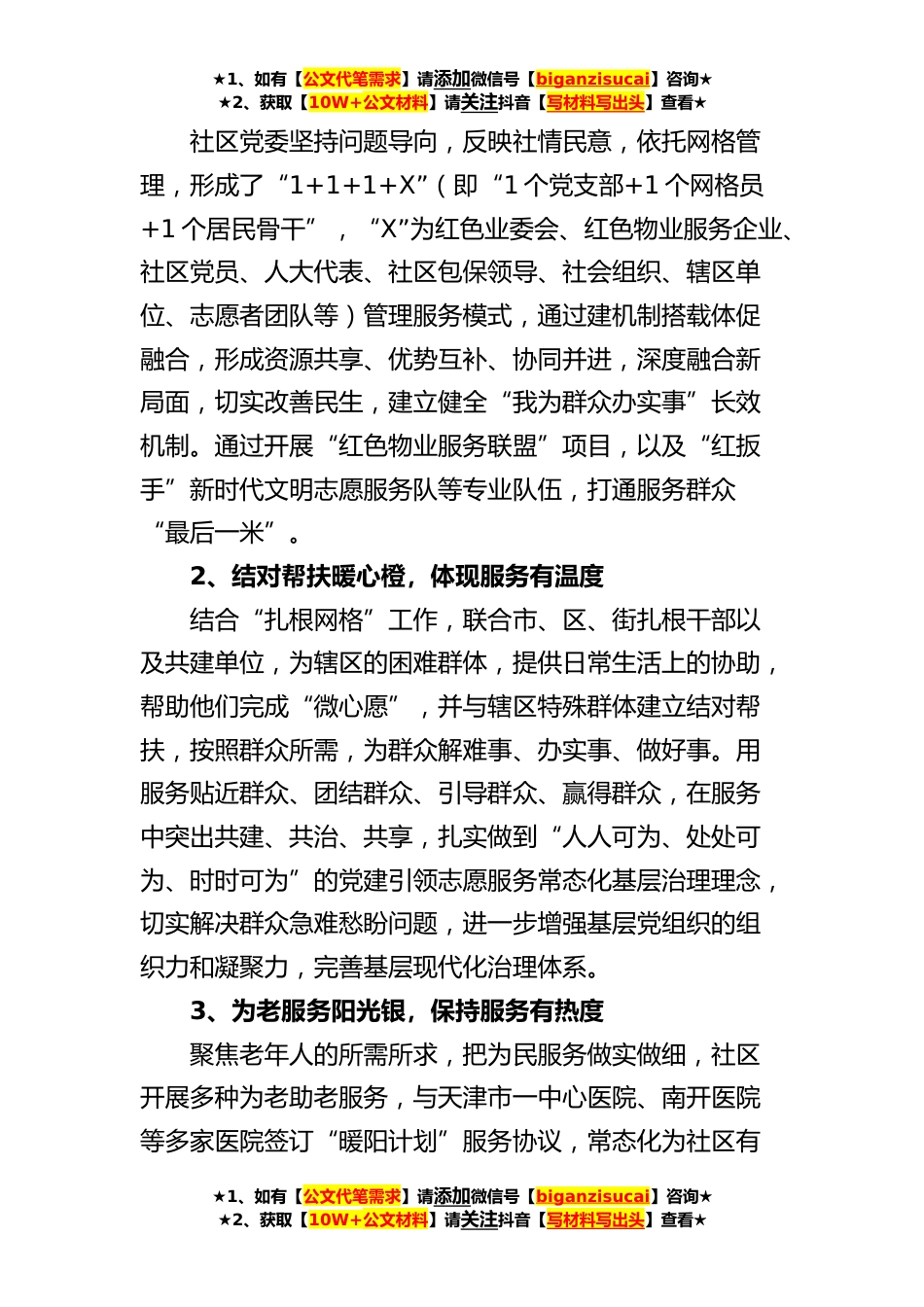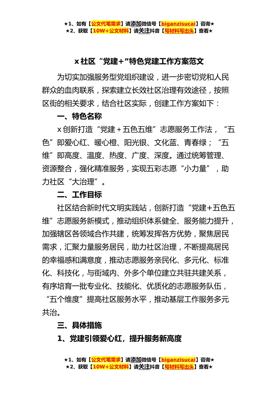 ★1、如有【公文代笔需求】请添加微信号【biganzisucai】咨询★★2、获取【10W+公文材料】请关注抖音【写材料写出头】查看★x社区“党建+”特色党建工作方案范文为切实加强服务型党组织建设,进一步密切党和人民群众的血肉联系,探索建立长效社区治理有效途径,按照区街的相关要求,结合社区实际,创建工作方案如下:一、特色名称x创新打造“党建+五色五维”志愿服务工作法,“五色”即爱心红、暖心橙、阳光银、文化蓝、青春绿;“五维”即高度、温度、热度、广度、深度。通过统筹管理、资源整合,强化精准服务,实现五彩志愿“小力量”,助力社区“大治理”。二、工作目标社区结合新时代文明实践站,创新打造“党建+五色五维”志愿服务新模式,推动组织体系健全、服务能力提升,加强辖区各领域合作共建,统筹发...