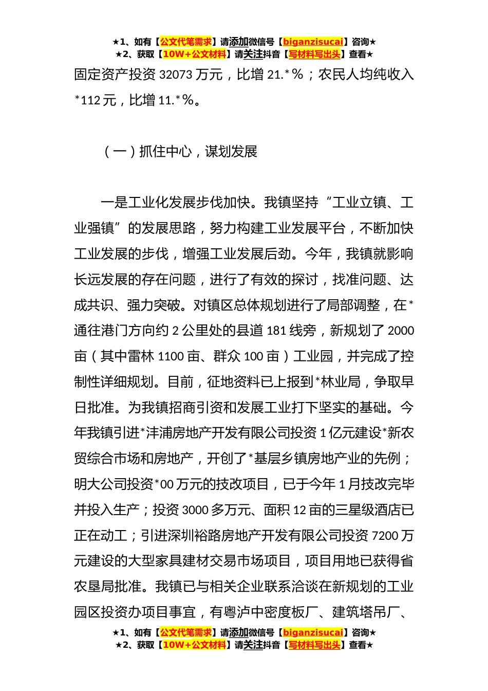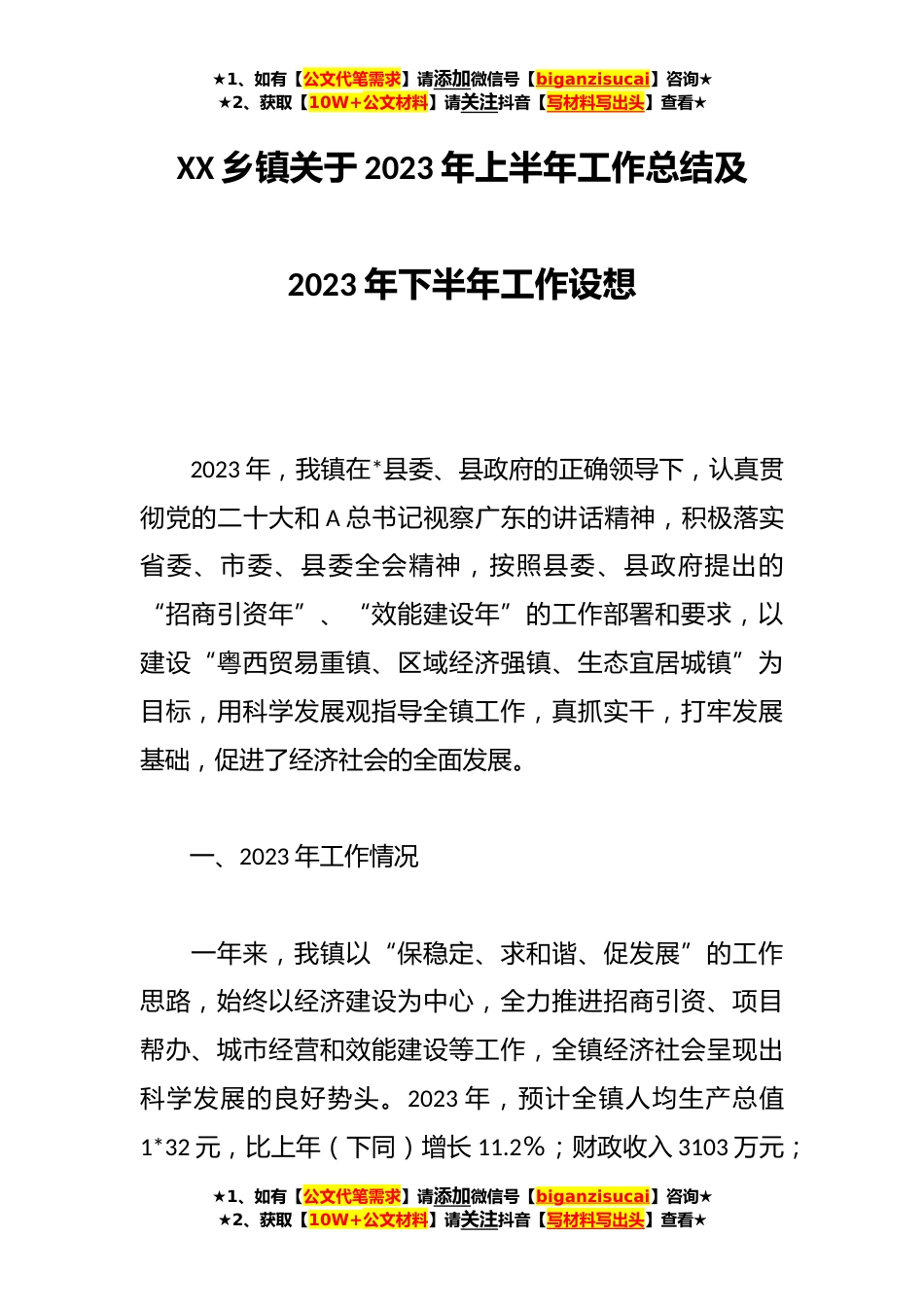 ★1、如有【公文代笔需求】请添加微信号【biganzisucai】咨询★★2、获取【10W+公文材料】请关注抖音【写材料写出头】查看★XX乡镇关于2023年上半年工作总结及2023年下半年工作设想2023年,我镇在*县委、县政府的正确领导下,认真贯彻党的二十大和A总书记视察广东的讲话精神,积极落实省委、市委、县委全会精神,按照县委、县政府提出的“招商引资年”、“效能建设年”的工作部署和要求,以建设“粤西贸易重镇、区域经济强镇、生态宜居城镇”为目标,用科学发展观指导全镇工作,真抓实干,打牢发展基础,促进了经济社会的全面发展。一、2023年工作情况一年来,我镇以“保稳定、求和谐、促发展”的工作思路,始终以经济建设为中心,全力推进招商引资、项目帮办、城市经营和效能建设等工作,全镇经济社会呈现出科学...