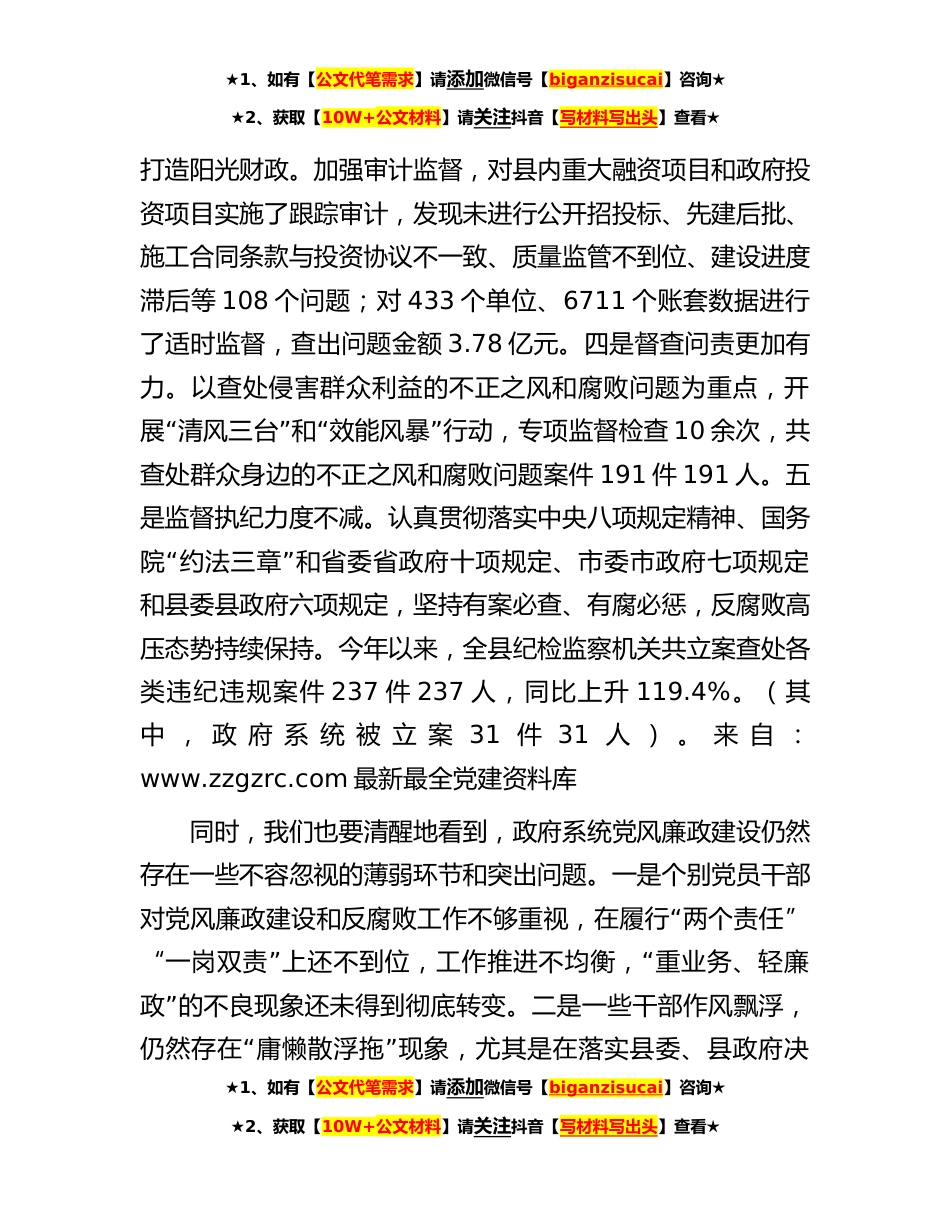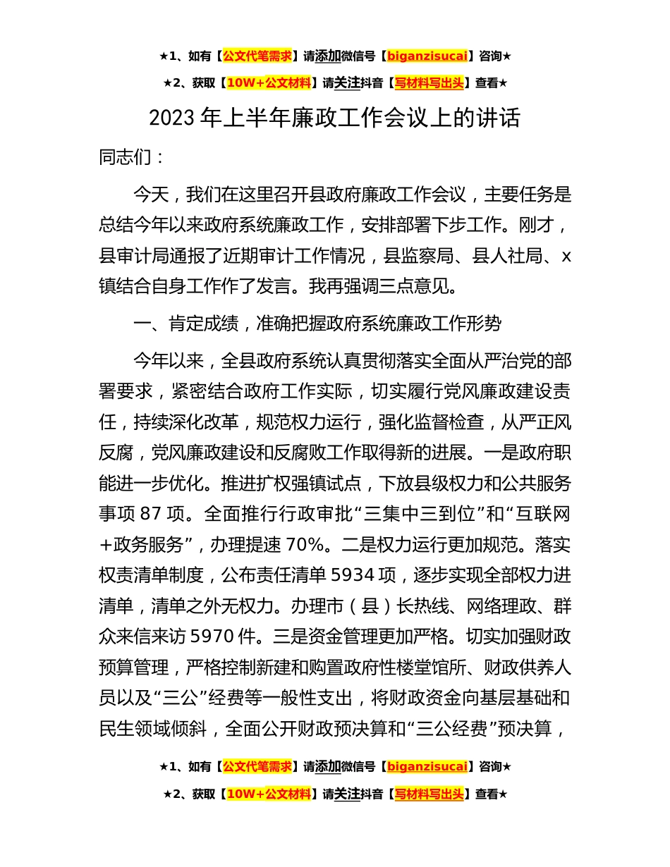 ★1、如有【公文代笔需求】请添加微信号【biganzisucai】咨询★★2、获取【10W+公文材料】请关注抖音【写材料写出头】查看★2023年上半年廉政工作会议上的讲话同志们:今天,我们在这里召开县政府廉政工作会议,主要任务是总结今年以来政府系统廉政工作,安排部署下步工作。刚才,县审计局通报了近期审计工作情况,县监察局、县人社局、x镇结合自身工作作了发言。我再强调三点意见。一、肯定成绩,准确把握政府系统廉政工作形势今年以来,全县政府系统认真贯彻落实全面从严治党的部署要求,紧密结合政府工作实际,切实履行党风廉政建设责任,持续深化改革,规范权力运行,强化监督检查,从严正风反腐,党风廉政建设和反腐败工作取得新的进展。一是政府职能进一步优化。推进扩权强镇试点,下放县级权力和公共服务事...