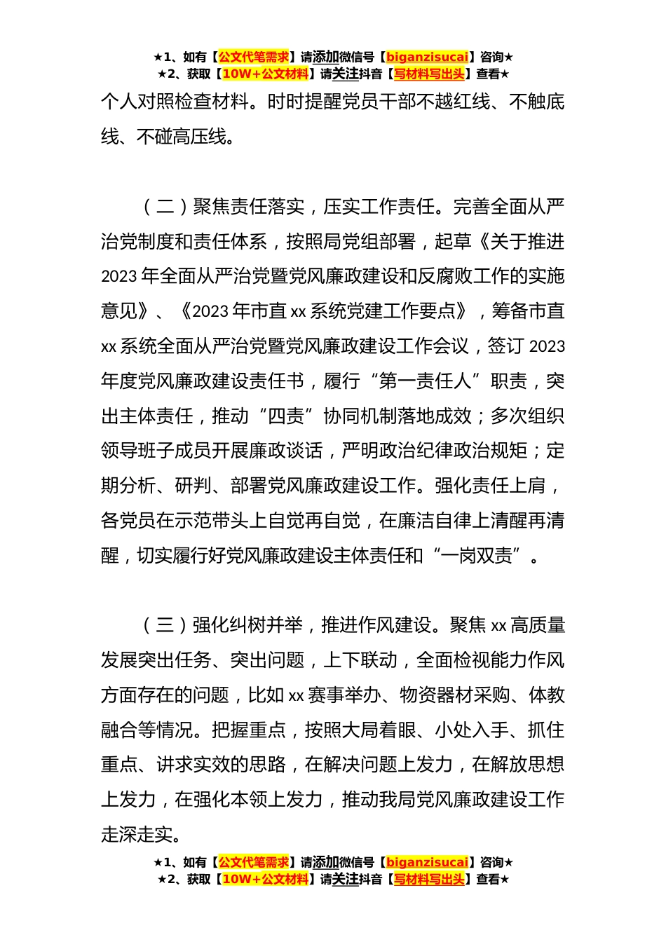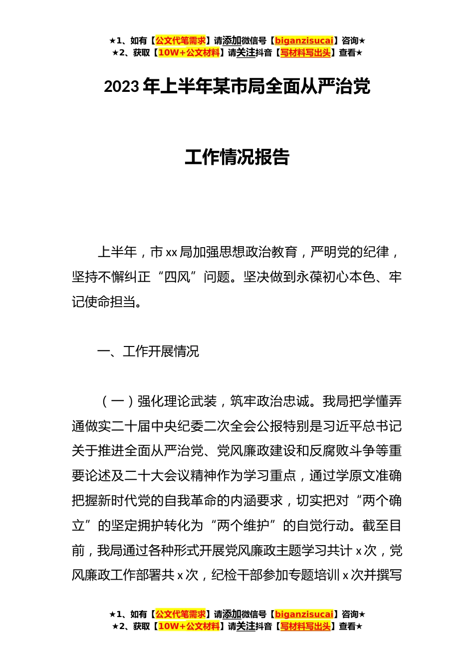★1、如有【公文代笔需求】请添加微信号【biganzisucai】咨询★★2、获取【10W+公文材料】请关注抖音【写材料写出头】查看★2023年上半年某市局全面从严治党工作情况报告上半年,市xx局加强思想政治教育,严明党的纪律,坚持不懈纠正“四风”问题。坚决做到永葆初心本色、牢记使命担当。一、工作开展情况(一)强化理论武装,筑牢政治忠诚。我局把学懂弄通做实二十届中央纪委二次全会公报特别是习近平总书记关于推进全面从严治党、党风廉政建设和反腐败斗争等重要论述及二十大会议精神作为学习重点,通过学原文准确把握新时代党的自我革命的内涵要求,切实把对“两个确立”的坚定拥护转化为“两个维护”的自觉行动。截至目前,我局通过各种形式开展党风廉政主题学习共计x次,党风廉政工作部署共x次,纪检干部参加...