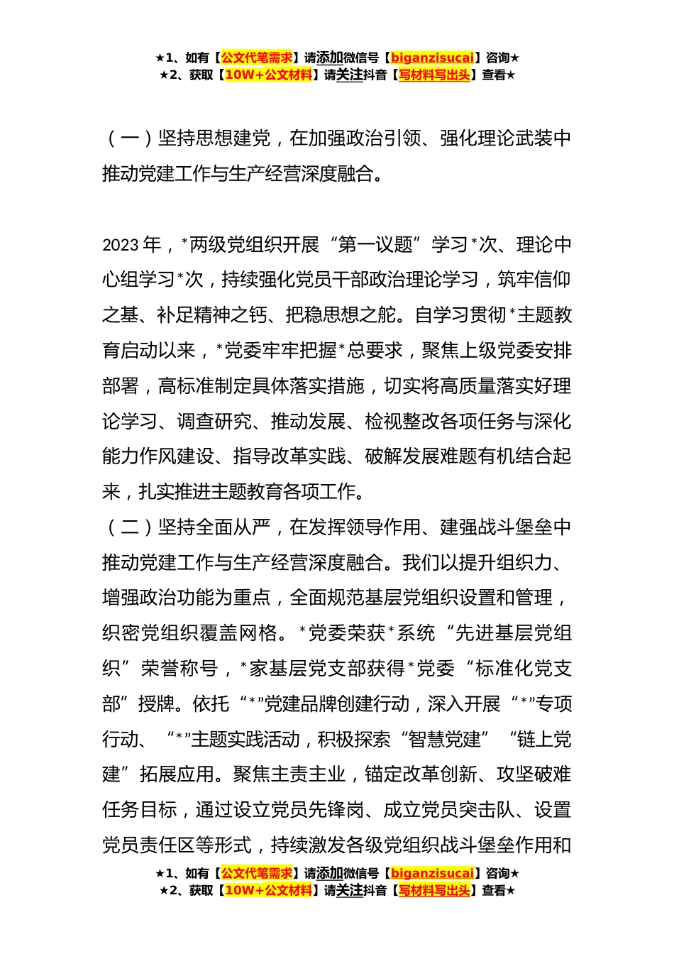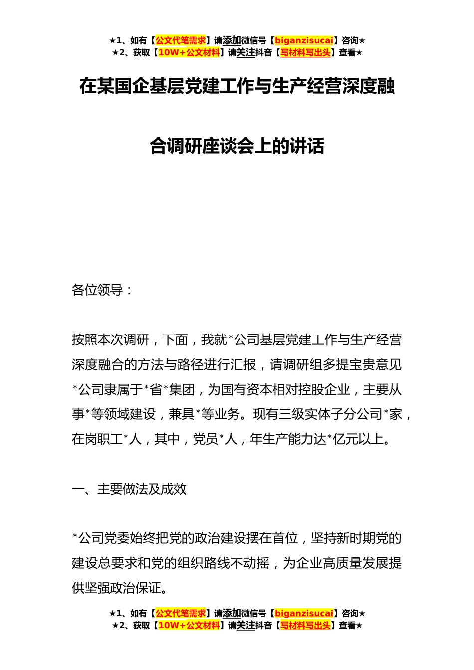 ★1、如有【公文代笔需求】请添加微信号【biganzisucai】咨询★★2、获取【10W+公文材料】请关注抖音【写材料写出头】查看★在某国企基层党建工作与生产经营深度融合调研座谈会上的讲话各位领导:按照本次调研,下面,我就*公司基层党建工作与生产经营深度融合的方法与路径进行汇报,请调研组多提宝贵意见*公司隶属于*省*集团,为国有资本相对控股企业,主要从事*等领域建设,兼具*等业务。现有三级实体子分公司*家,在岗职工*人,其中,党员*人,年生产能力达*亿元以上。一、主要做法及成效*公司党委始终把党的政治建设摆在首位,坚持新时期党的建设总要求和党的组织路线不动摇,为企业高质量发展提供坚强政治保证。★1、如有【公文代笔需求】请添加微信号【biganzisucai】咨询★★2、获取【10W+公文材料】请关注...