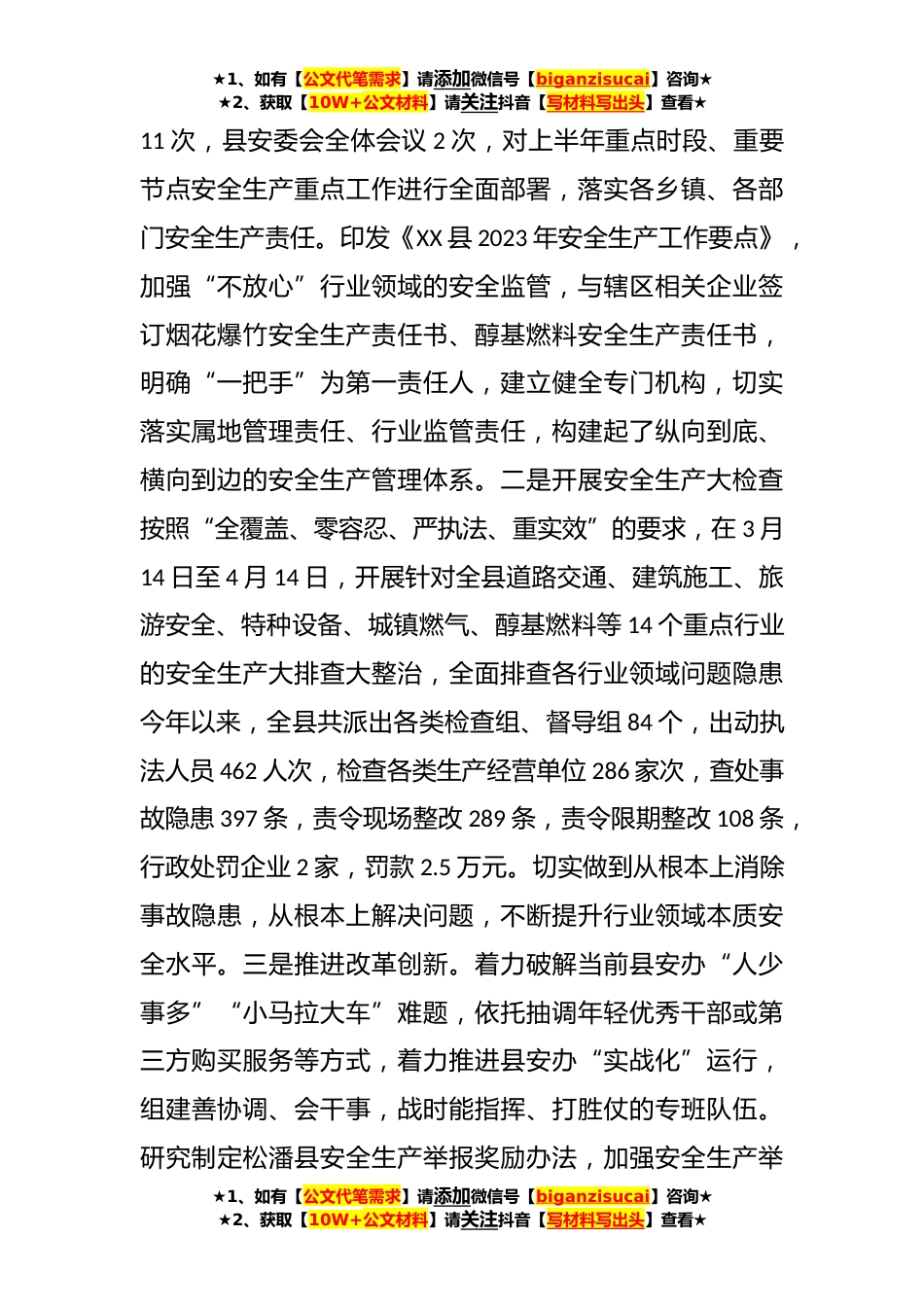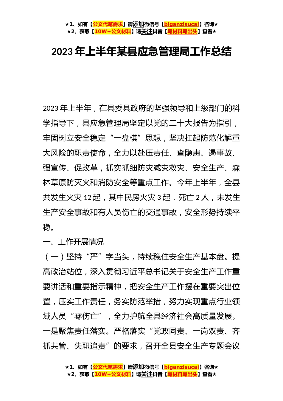 ★1、如有【公文代笔需求】请添加微信号【biganzisucai】咨询★★2、获取【10W+公文材料】请关注抖音【写材料写出头】查看★2023年上半年某县应急管理局工作总结2023年上半年,在县委县政府的坚强领导和上级部门的科学指导下,县应急管理局坚定以党的二十大报告为指引,牢固树立安全稳定“一盘棋”思想,坚决扛起防范化解重大风险的职责使命,全力以赴压责任、查隐患、遏事故、强宣传、促改革,抓实抓细防灾减灾救灾、安全生产、森林草原防灭火和消防安全等重点工作。今年上半年,全县共发生火灾12起,其中民房火灾3起,死亡2人,未发生生产安全事故和有人员伤亡的交通事故,安全形势持续平稳。一、工作开展情况(一)坚持“严”字当头,持续稳住安全生产基本盘。提高政治站位,深入贯彻习近平总书记关于安全生产...