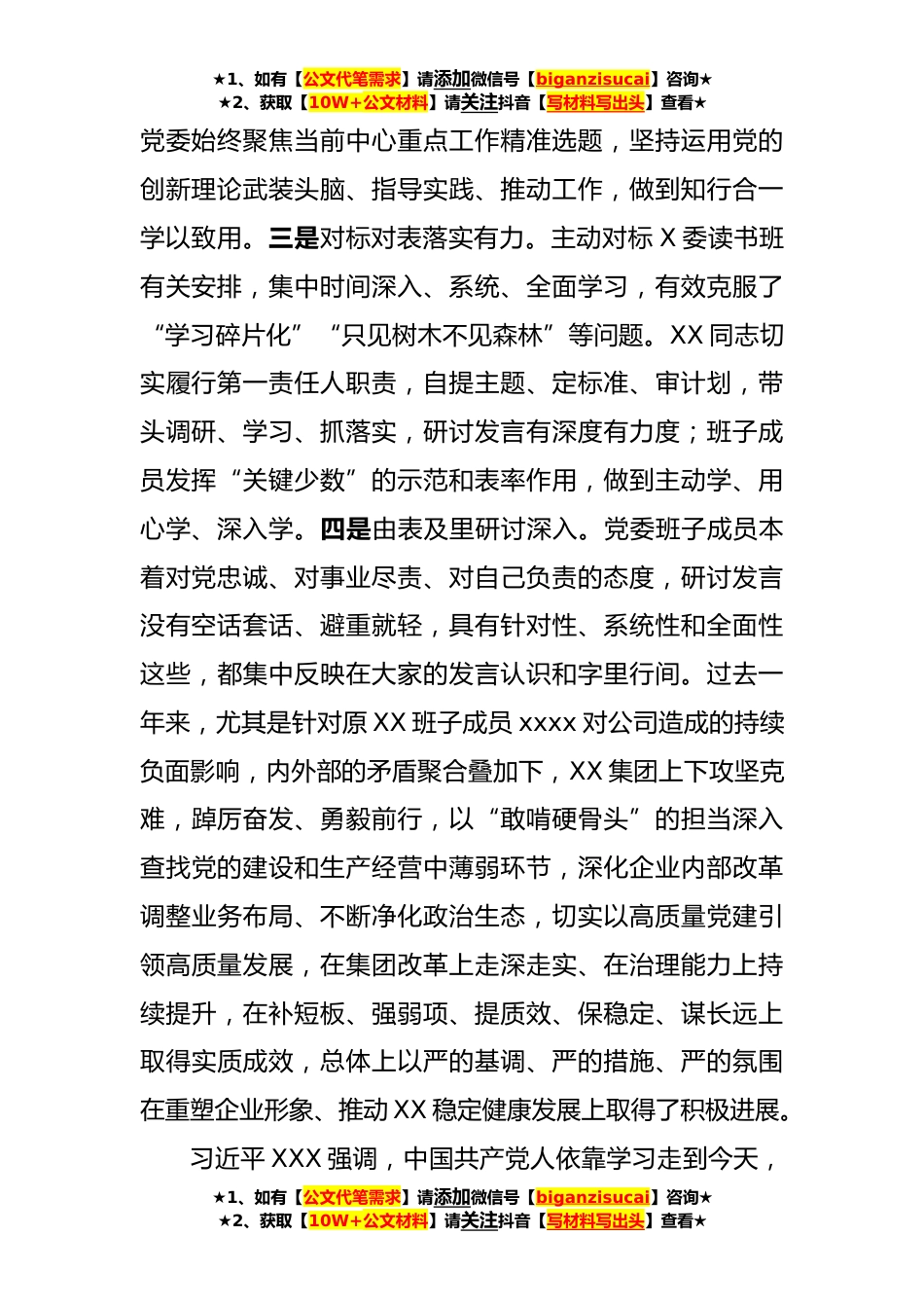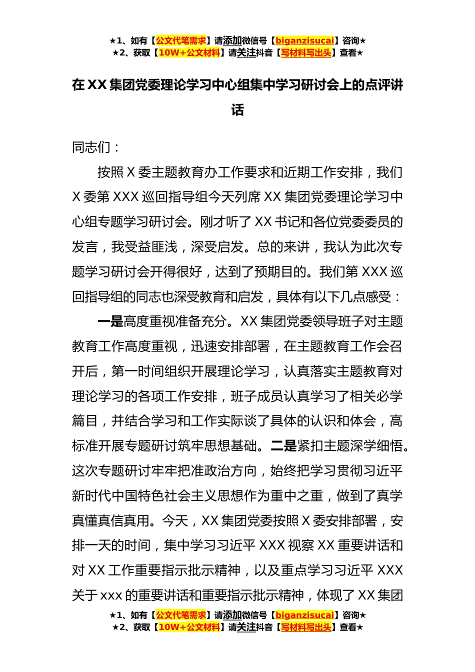 ★1、如有【公文代笔需求】请添加微信号【biganzisucai】咨询★★2、获取【10W+公文材料】请关注抖音【写材料写出头】查看★在XX集团党委理论学习中心组集中学习研讨会上的点评讲话同志们:按照X委主题教育办工作要求和近期工作安排,我们X委第XXX巡回指导组今天列席XX集团党委理论学习中心组专题学习研讨会。刚才听了XX书记和各位党委委员的发言,我受益匪浅,深受启发。总的来讲,我认为此次专题学习研讨会开得很好,达到了预期目的。我们第XXX巡回指导组的同志也深受教育和启发,具体有以下几点感受:一是高度重视准备充分。XX集团党委领导班子对主题教育工作高度重视,迅速安排部署,在主题教育工作会召开后,第一时间组织开展理论学习,认真落实主题教育对理论学习的各项工作安排,班子成员认真学习了相关必...