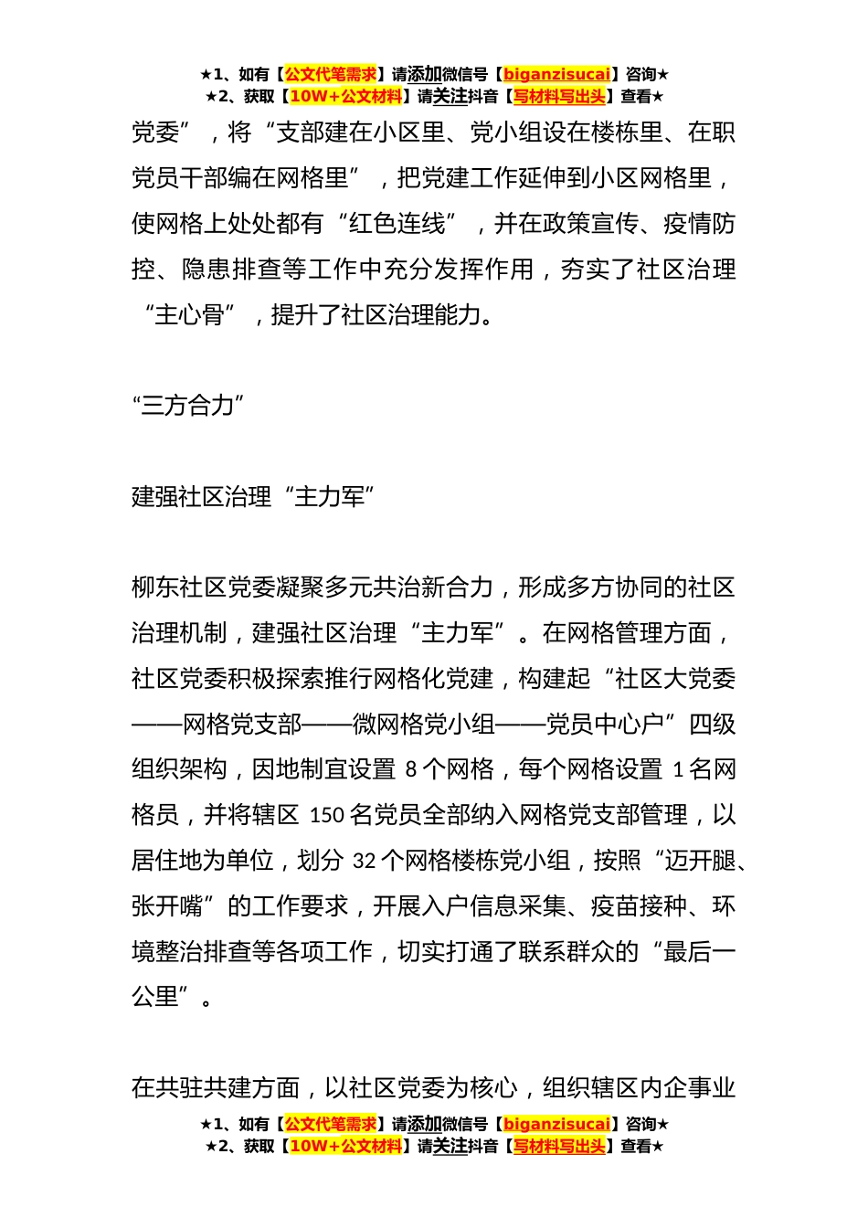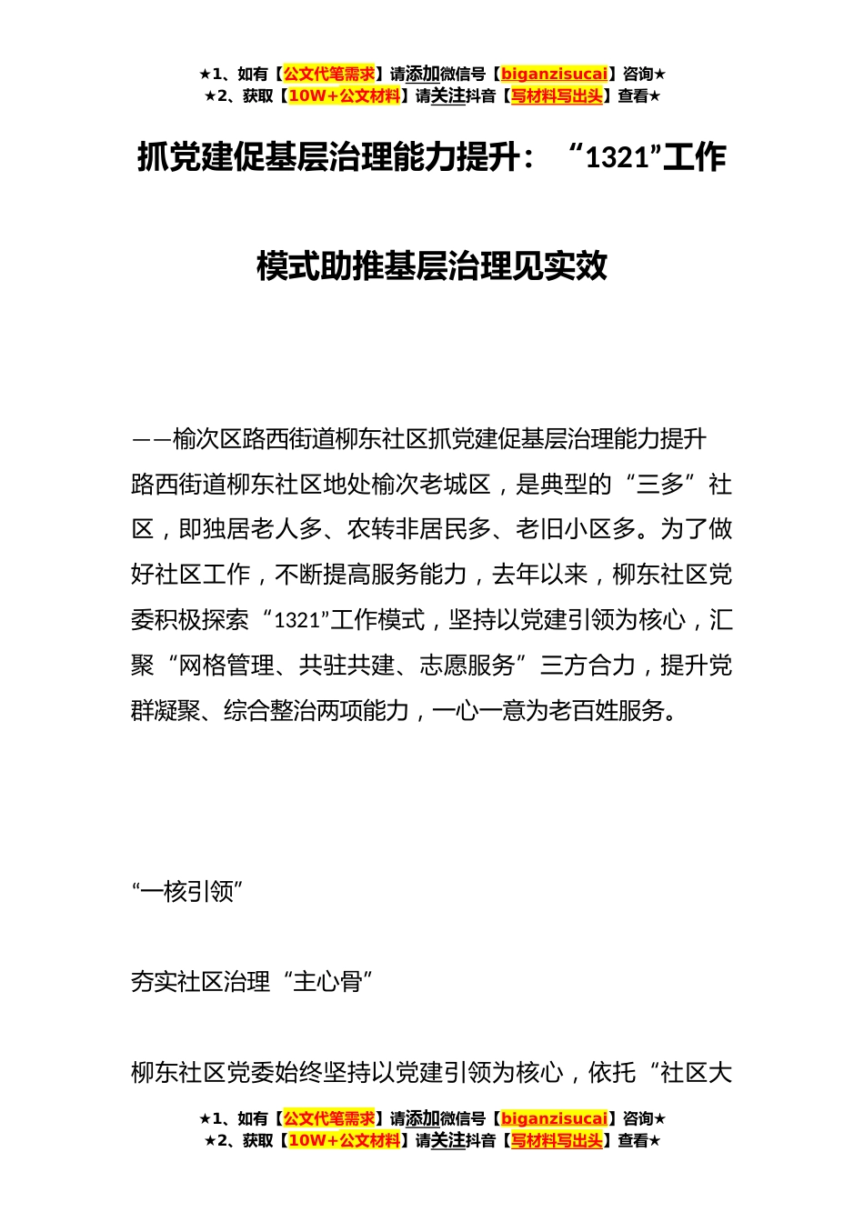 ★1、如有【公文代笔需求】请添加微信号【biganzisucai】咨询★★2、获取【10W+公文材料】请关注抖音【写材料写出头】查看★抓党建促基层治理能力提升:“1321”工作模式助推基层治理见实效——榆次区路西街道柳东社区抓党建促基层治理能力提升路西街道柳东社区地处榆次老城区,是典型的“三多”社区,即独居老人多、农转非居民多、老旧小区多。为了做好社区工作,不断提高服务能力,去年以来,柳东社区党委积极探索“1321”工作模式,坚持以党建引领为核心,汇聚“网格管理、共驻共建、志愿服务”三方合力,提升党群凝聚、综合整治两项能力,一心一意为老百姓服务。“一核引领”夯实社区治理“主心骨”柳东社区党委始终坚持以党建引领为核心,依托“社区大★1、如有【公文代笔需求】请添加微信号【biganzisucai】...