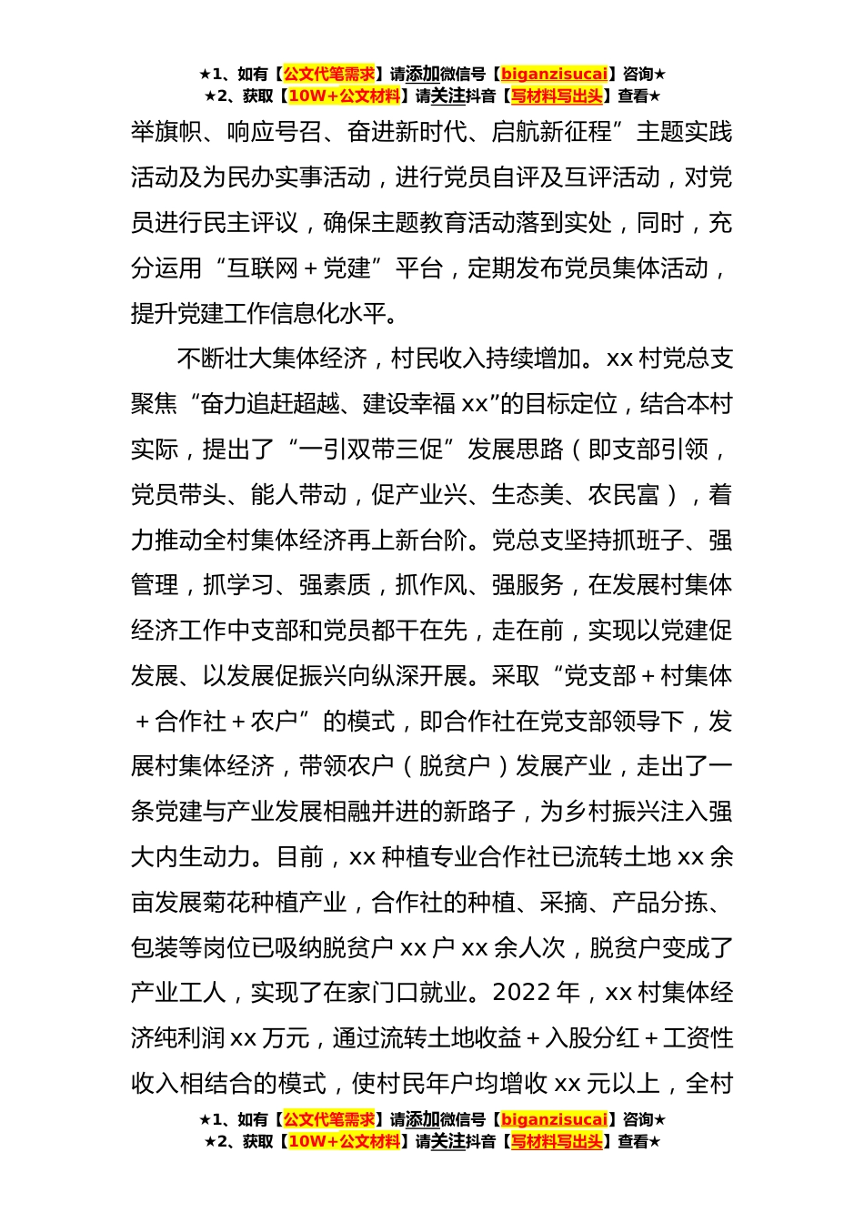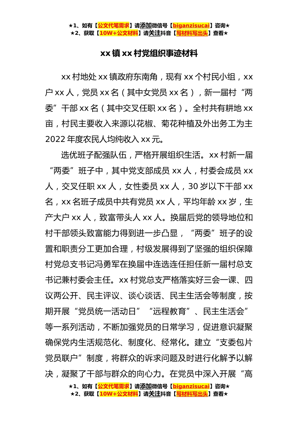 ★1、如有【公文代笔需求】请添加微信号【biganzisucai】咨询★★2、获取【10W+公文材料】请关注抖音【写材料写出头】查看★xx镇xx村党组织事迹材料xx村地处xx镇政府东南角,现有xx个村民小组,xx户xx人,党员xx名(其中女党员xx名),新一届村“两委”干部xx名(其中交叉任职xx名)。全村共有耕地xx亩,村民主要收入来源以花椒、菊花种植及外出务工为主2022年度农民人均纯收入xx元。选优班子配强队伍,严格开展组织生活。xx村新一届“两委”班子中,其中党支部成员xx人,村委会成员xx人,交叉任职xx人,女性委员xx人,30岁以下干部xx名,xx名班子成员中共有党员xx人,平均年龄xx岁,生产大户xx人,致富带头人xx人。换届后党的领导地位和村干部领头致富能力得到进一步凸显,“两委”班子的设置和职责分工更加合理...